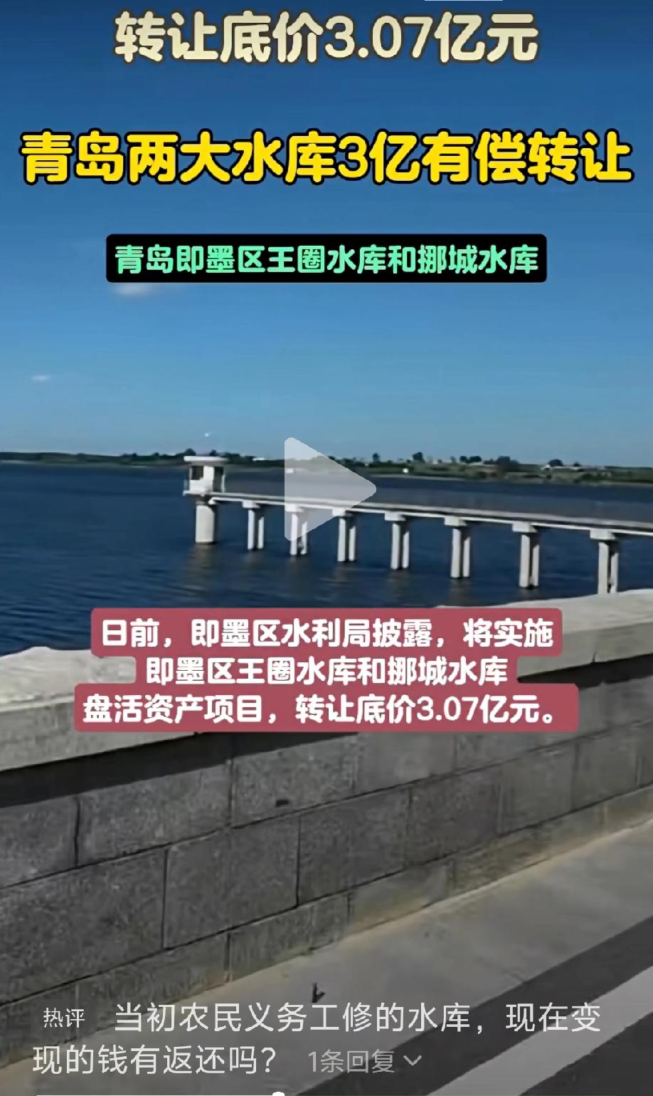 底价3个亿公开竞拍,我靠,这年头水库都能出售,即墨这是穷底掉了,把水库都卖了! 即墨王圈水库属于饮用水水源,主要供应即墨城区和东部生活饮用水。而挪城水库更是即墨四大水库之一,同样是为即墨提供饮用水的重要水库。 如今这么重要的水库居然要公开竞拍,而且政府授权取水权,可以合法销售,这是穷到这种地步了么? 更令人担忧的是,水源可是关系到千家万户生命安全的重要资源,万一被不法分子掌控,人民群众的饮水安全如何保障,这么重大的事情,不知道是否公开征求过市民的意见。 水源被公开出售,水质安全、水价等一系列问题如何做到保障 ,是否发布公开信息以安定民心,这些目前都不知道。