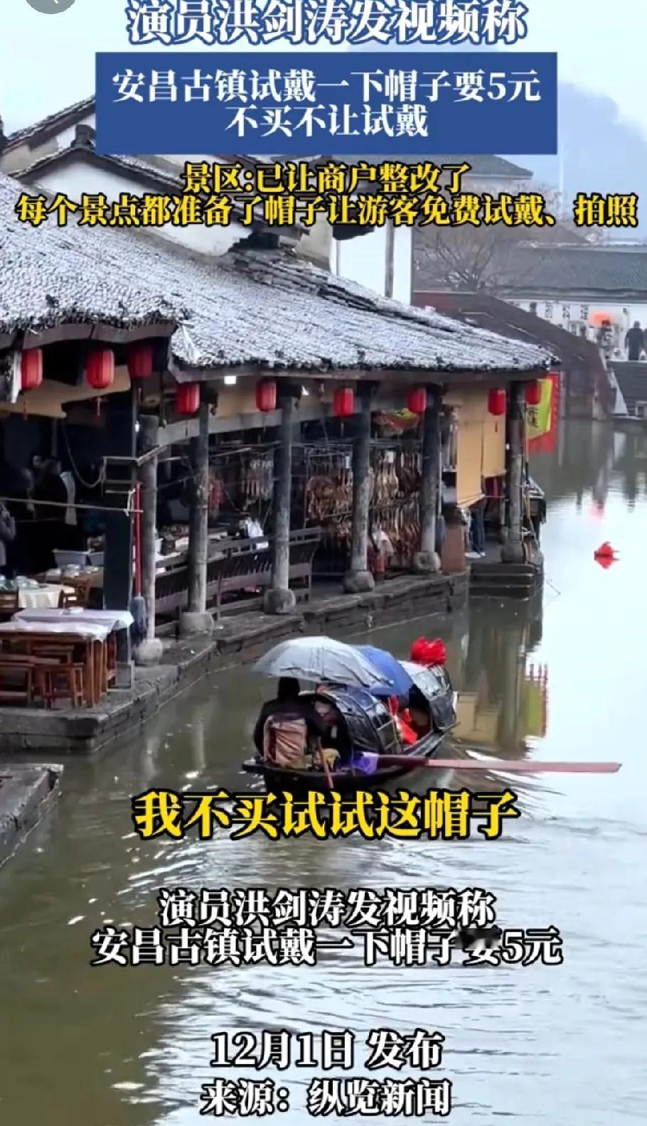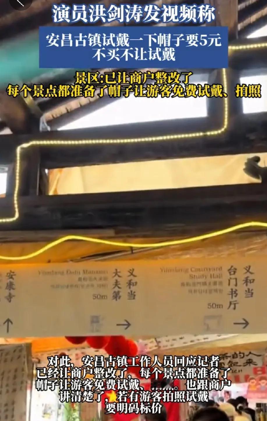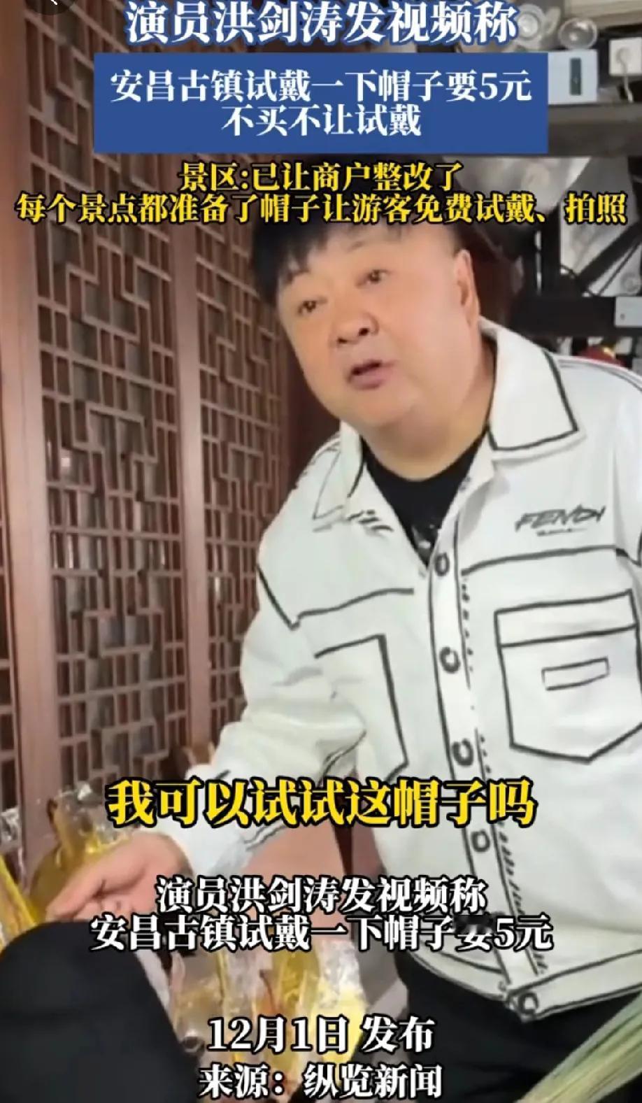 我敢肯定景区这商家肯定不认识洪剑涛 不然她不会说试戴一下帽子要5元 也是明星效应,不然效果哪里这么快! 试戴一下帽子要5元,是过了!不试戴怎么知道好看不好看,怎么买?顾客是上帝,这服务态度也有问题。好好的景区都被这些商贩给搞塌的。 不过,换种思路,站商家的角度。很多人现在只试不买,然后拍照走人。更何况,洪剑涛说不买试试,这话搁商家那就是想占便宜,不打算买试什么。 这5元看似是“试戴费”,其实是对蹭戴行为无声的抗议!只是没想到这回碰到“硬骨头”了,商家只能自认倒霉,谁让你说错话了,下回面对这种情况,记得说出租费。