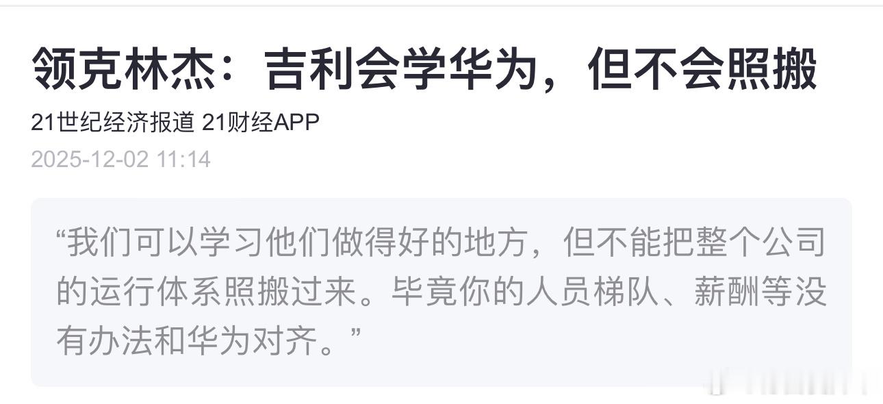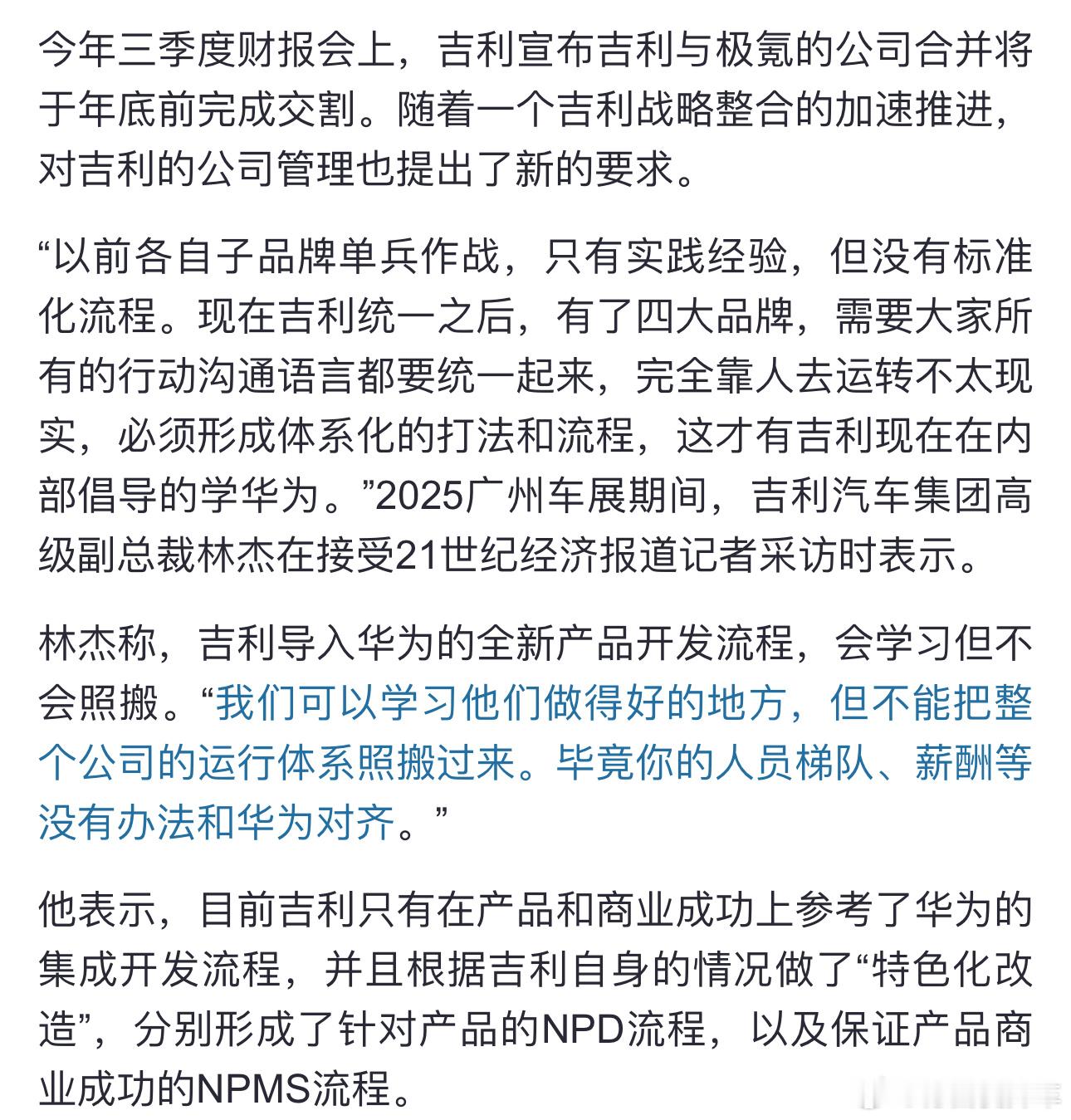 吉利会学华为但不会照搬,形成了NPD和NPMS流程,9X、900、M9是首批产品。吉利