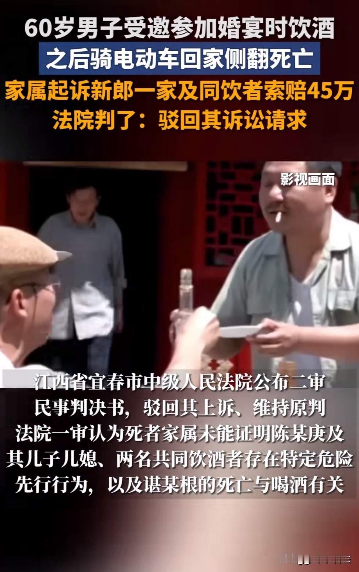 江西宜春,男子邀请60岁的战友来参加儿子婚礼。席间,战友和其他2个多年未见的熟人共同饮酒,男子喝了2两53度的白酒,其他2人均未有劝酒行为。酒席结束后,男子见战友并未喝多,就让战友自己骑着电动车回家了。哪曾想,战友途中发生侧翻,不幸离世了。事后,战友家属不干了,将男子以及男子儿子和儿媳,还有2名同饮者一并告上法院,要求赔偿45万余元。法院这样判的。 2023年10月4日,是陈某庚的儿子陈某雄和儿媳曾某雯结婚的大喜日子。 陈某庚早早就忙活开了,从酒店布置到宾客名单,里里外外操持了大半个月,就盼着儿子能风风光光地成家。 中午12点,选定的那家酒店里已是人声鼎沸、喜气洋洋。 陈某庚穿满脸堆笑地迎接着每一位客人。 在熙熙攘攘的宾客中,有几张熟悉的面孔让陈某庚格外高兴。 那是他的老战友谌某根、邹某华和简某良。这几位老伙计,当年在部队里摸爬滚打,结下了过命的交情,后来退伍各自成家,平时见面不多,但情谊一点没淡。 谌某根这天是骑着电动车来的,到了世博华城小区门口,正好碰到了邹某华和简某良,三人说说笑笑,一路溜达着就进了酒店。 除了老战友,陈某庚的好朋友王某元、陈某名也来了。巧的是,这俩人跟谌某根竟然也是老相识。 今年60岁的谌某根,年轻的时候开过好几年大货车,跑南闯北的,就是在那段跑运输的日子里,认识了同样在货运圈里打转的王某元、陈某名。 一晃几十年过去,没想到居然能借着陈某庚儿子的婚宴再聚到一起,这缘分真是说都说不清。 婚宴开席后,这几位老熟人自然而然就凑到了同一桌。 桌上摆满了鸡鸭鱼肉,荤素搭配得恰到好处,旁边还放着饮料和酒,陈某庚早就交代过,大家喝什么全凭自愿,千万别客气。 其他宾客有的喝饮料,有的浅酌几口啤酒,只有谌某根、王某元、陈某名这三个老伙计,一打开话匣子就收不住了,聊着当年跑运输时遇到的趣事、走过的险路,越聊越投机,当即就决定喝点白酒助兴。 桌上摆着的是陈某庚特意定制的白酒,一斤装的瓶子,酒精度数是53度的酱香型,闻着就香气浓郁。 三人也没讲究什么规矩,自己给自己倒酒,想喝多少就倒多少。 席间没有谁劝谁喝酒,更没有猛灌的情况,都是一边回忆往事,一边慢悠悠地抿着,气氛轻松又惬意。 王某元的酒量向来不错,这天心情好,不知不觉就喝了4两左右;陈某名酒量稍逊一筹,喝了3两多就放下了酒杯;谌某根年纪大了,酒量也不如从前,喝了2两左右就摆摆手说“不喝了,尽兴就行”。 一瓶一斤装的白酒,三人没喝完,还剩下小半瓶。 中途,陈某庚带着穿着婚纱礼服的儿子儿媳,端着杯子过来敬酒。 他敬完酒就带着孩子们去了下一桌,全程没提加酒的事,更没有劝任何人再喝一杯。 婚宴热热闹闹地散了席,谌某根和邹某华、简某良一起往外走。 他当时看起来精神头挺好,脚步稳稳当当,说话也条理清晰,一点没有喝醉的样子,跟两个老战友有说有笑地走回了世博华城小区门口。 到了小区门口,谌某根跟邹某华、简某良挥挥手告了别:“我先回家了,改天再聚!”说完,他就骑上自己的电动车,朝着家的方向出发了。谁也没想到,这竟是大家跟他说的最后一句话。 下午1点30分,谌某根骑着电动车在路上行驶时,不知怎的突然侧翻,他整个人重重地摔在了地上,当场就受了重伤。 路过的好心人见状,赶紧拨打了急救电话,但最终还是没抢救过来,身亡了。 事后,相关部门对谌某根进行了检测,结果显示他血液中乙醇成分含量为22.17mg/100mL,虽然达到了酒驾的标准,但远未到醉驾的程度。 至于他的具体死因,原本需要通过解剖检验才能确定,可谌某根的家属拒绝尸检。 悲痛之下,谌某根的家属将陈某庚、陈某庚的儿子儿媳,以及和谌某根一起喝酒的王某元、陈某名告上了法院,索赔45万余元。 他们认为,正是因为参加婚宴喝了酒,才导致谌某根发生意外,这些宴请者和同饮者都应该承担责任。 《民法典》第1166条规定,行为人因过错侵害他人民事权益造成损害的,应当承担侵权责任。 陈某庚以及其儿子、儿媳认为,谌某根家属拒绝尸检,又不能证明其死亡和喝酒有直接关系,因此,不能把责任推给他们。 两位同饮者也认为很冤枉,认为席间并未有劝酒行为,全凭自愿,总不能人家自己想喝酒,还要强行进行阻止吧。 2、法院审理后认为谌某根作为一个成年人,对于过量饮酒可能导致的后果,应当有清晰的认知和判断。 《民法典》第18条 成年人为完全民事行为能力人,可以独立实施民事法律行为。 最后,一审法院驳回谌某根家属的诉求。 一审判决后,其家属不服,提起上诉,二审维持原判。