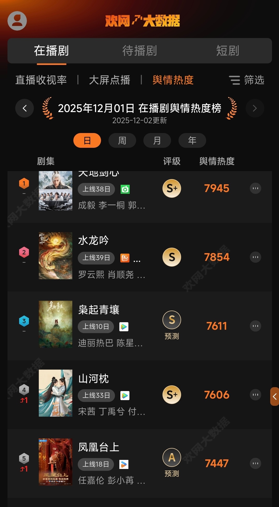 12月2日宋茜一番女主剧山河枕欢网舆情热度依旧保持第四!上星和网播已经完结还有