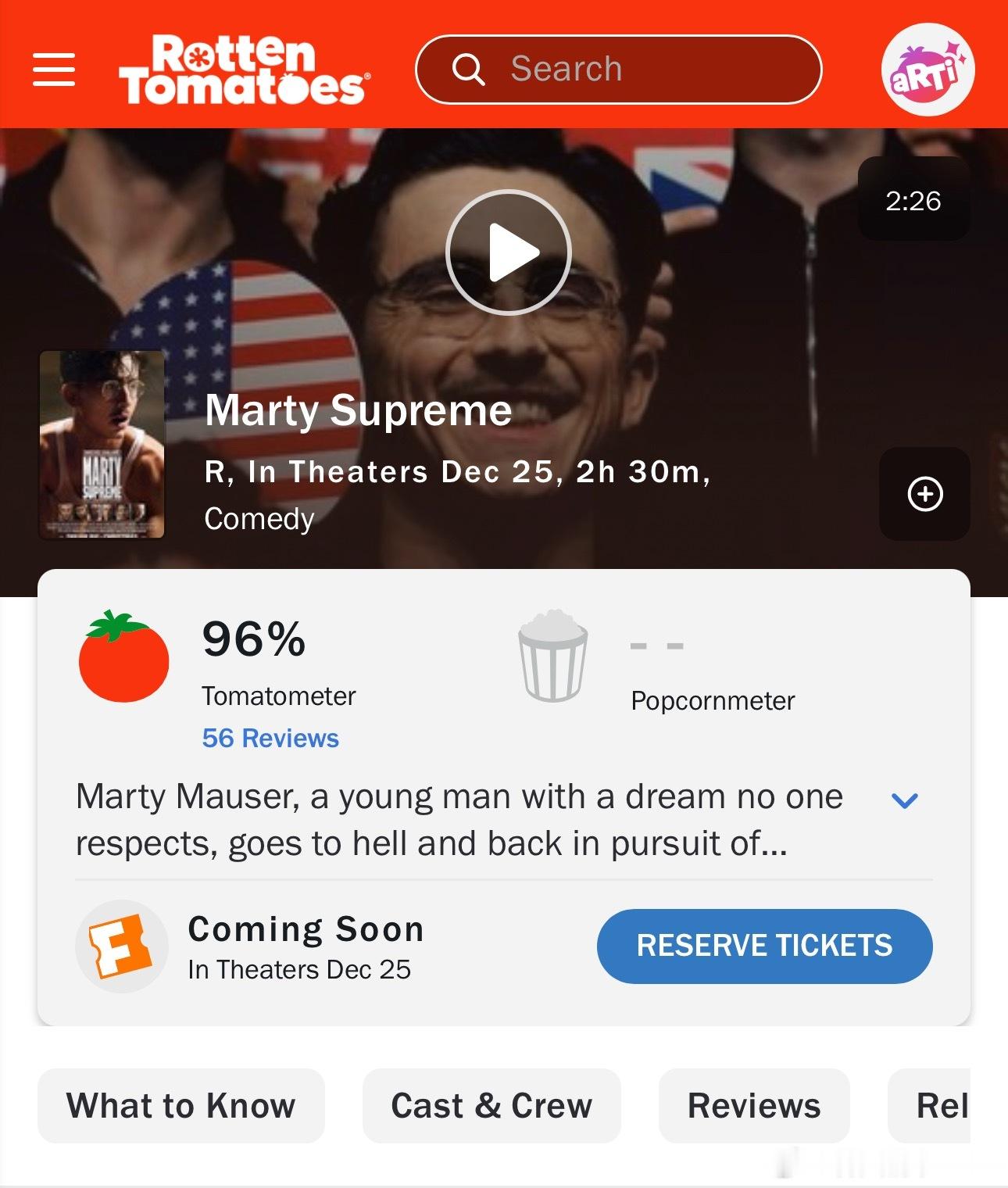 “甜茶”提莫西·查拉梅主演的《至尊马蒂》烂番茄新鲜度96%,MTC评分88。有评论说这是他职业生涯目前的最佳表演,烂番茄评分在他出演的电影中仅次于《伯德小姐》