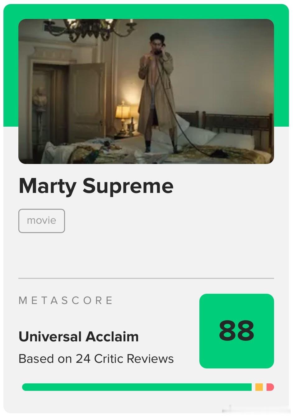“甜茶”提莫西·查拉梅主演的《至尊马蒂》烂番茄新鲜度96%,MTC评分88。有评