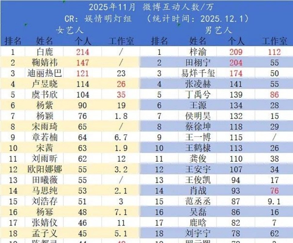 11月微博平台男女明星微博互动人数排名🈶女明星前三:白鹿、鞠婧祎、迪丽热巴;男明星前三:梓渝、田栩宁、易烊千玺。