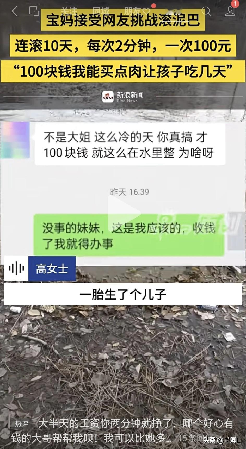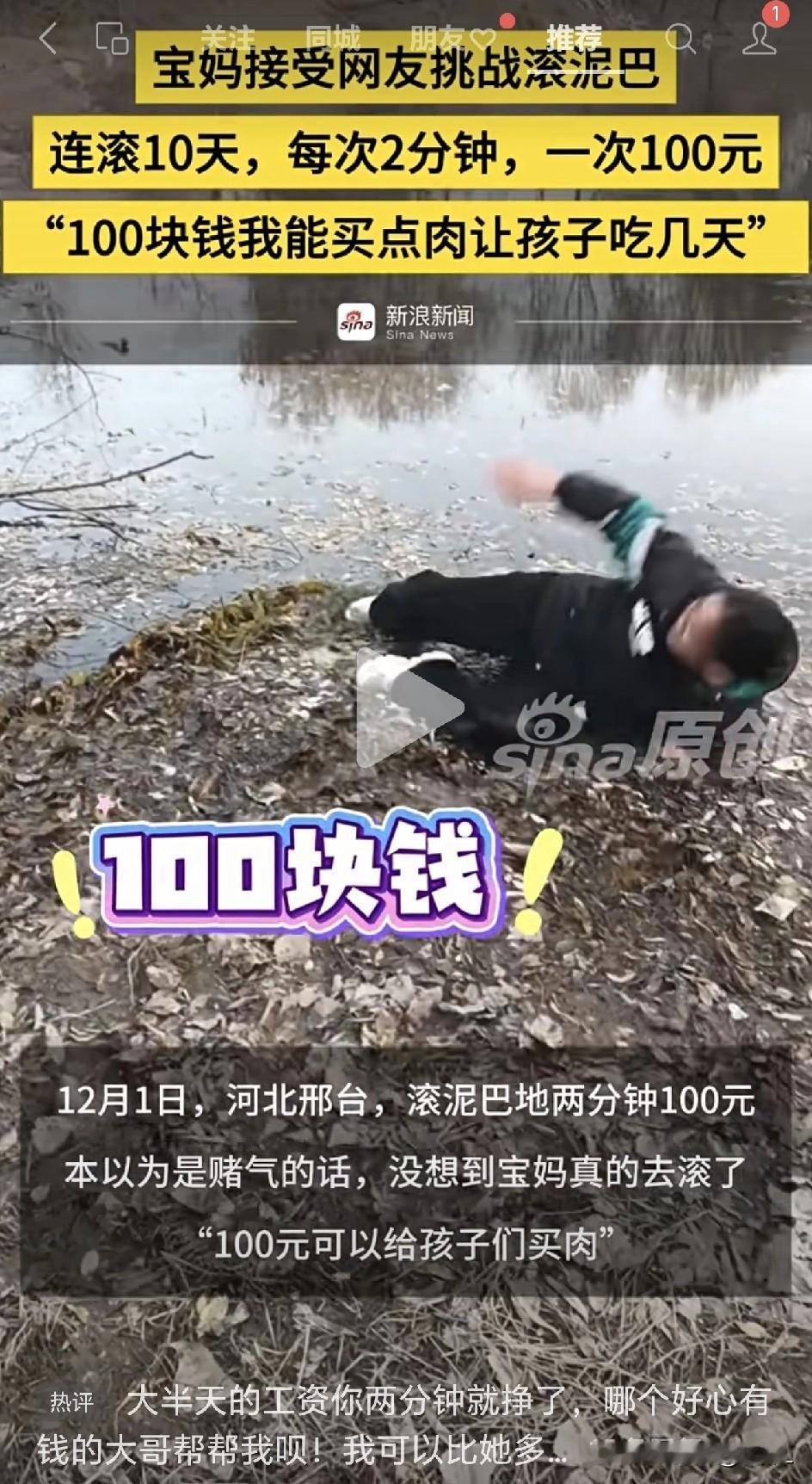 三宝妈为千元挑战泥水打滚:生活面前,谁不是“狠人”? 最近,一位河北邢台的年轻妈妈,为了一笔对她来说不菲的收入,在社交媒体上火了起来。 她是一位三个儿子的宝妈,接受网友的挑战,在泥水里滚泥巴,连滚10天,每次2分钟,一次100元。 在12月1日的视频里,宝妈躺进泥水里,来回翻滚,嘴里还嘱咐着拍视频的人,“2分钟到了喊我。”、“你扭脸看看孩子。” 据说,宝妈看到一位大哥在泥水里打滚的视频,就说要是有人愿意给自己100块钱,自己也愿意滚。 没想到,真有网友不信,就和宝妈对赌,双方约定,连滚10天,每次2分钟,一次100元。 所有人都以为这只是口嗨,直到她真的躺进了冬天冰冷的泥水里。 当网友真看到宝妈为了这1000元钱,跑到又冷又脏的泥水里翻滚时,一时也是难以接受,“不是大姐,这么冷的天,你真搞?才100块钱,就这么在水里整,为啥呀?” 宝妈则表示,自己拿了钱就得办事,按照双方的约定,不打折扣。 宝妈说,自己一胎是个儿子,二胎是双胞胎儿子,这100块钱的肉,可以让孩子们吃好几天。 网友为自己赌气的轻率行为向宝妈道歉,钱也真给了,也对宝妈表达了心疼和敬佩。宝妈说,自己没生网友的气,因为自己确实想挣这1000块钱。 评论区的网友纷纷破防,无数人纷纷留言表达心酸与共鸣: “如果有人愿意出一百元两分钟,我要滚到他怀疑人生。” “大多数人看着光鲜亮丽,其实都是在生活的泥潭里挣扎罢了。” “人家是做善事了,你也是靠自己挣来的钱。只是觉得心酸酸的。” “不当家不知柴米贵,不养儿不知父母恩。” “我怎么看了想哭?” “我单亲妈妈,能理解她,换我也会干,比我上班12小时赚的多多了。” “一个为了玩,一个为了生存,无奈的人世间。” “你扭脸看下孩子,我作为一个男人泪目了。” 不由想起一位朋友,离职后在家待了几年,最近不知家里出了什么变故,开始出门找工作。 即便三千块钱的工作,也想积极争取,却没想到人家一听40+的年龄,直接拒绝,长的面相年轻也不行。 最后只能放下了所有矜持,加入零工大军。做临促,开始是真张不开嘴,等到真逼得没办法了,嘴也张开了,腿也能迈出去了。 她说,只要有钱挣,面子是何物? 这句话背后,是多少成年人被迫修炼的生存哲学。 网络放大了人生的参差,也让我们得以窥见彼此的不易。 那位打赌的网友,从最初的戏谑到后来的歉意与敬佩,其态度的转变,正源于她透过屏幕,触碰到了一份沉甸甸的真实生活。 生活不是剧本,没有那么多光鲜的桥段。更多时候,它要求我们在泥泞中前行,在寒风中坚持。 尊重每个为生活努力的人! 信息来源于新浪新闻,侵联删!