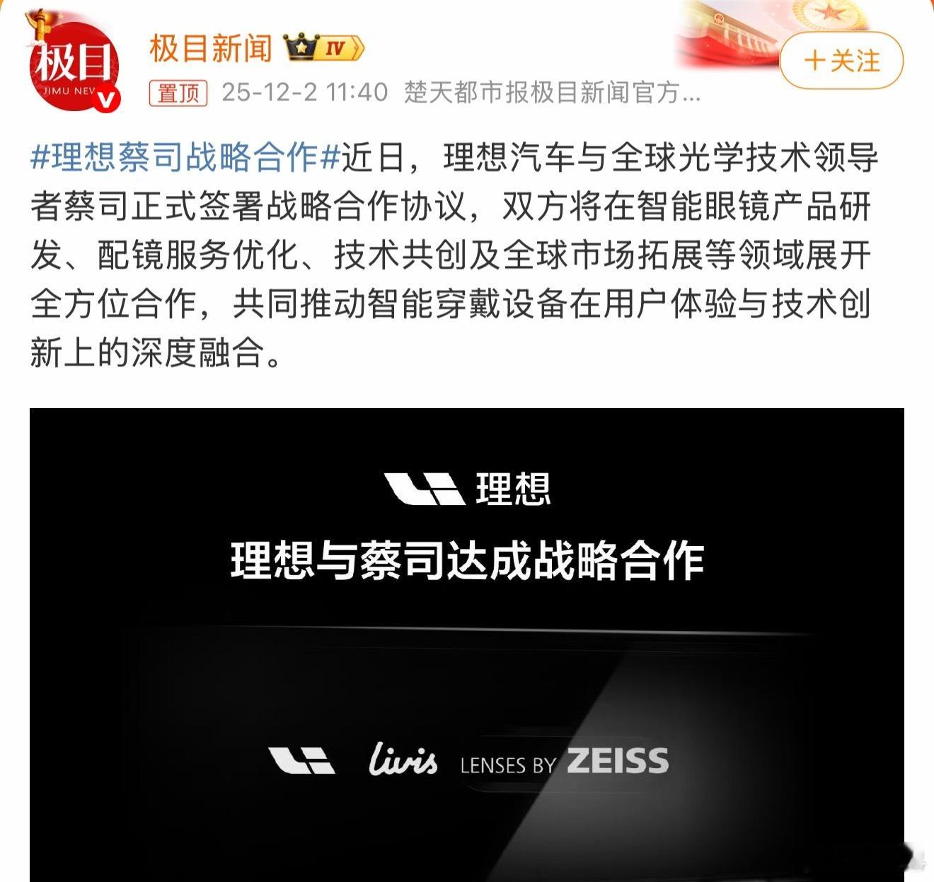理想蔡司战略合作 应该是理想的眼镜镜片吧,蔡司镜片天下无敌。