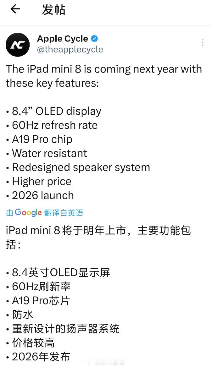 iPad mini8 明年上市,该系列首次配备 OLED 屏,8.4 英寸,不过刷新率还是祖传的 60Hz,依旧刀法精准。
