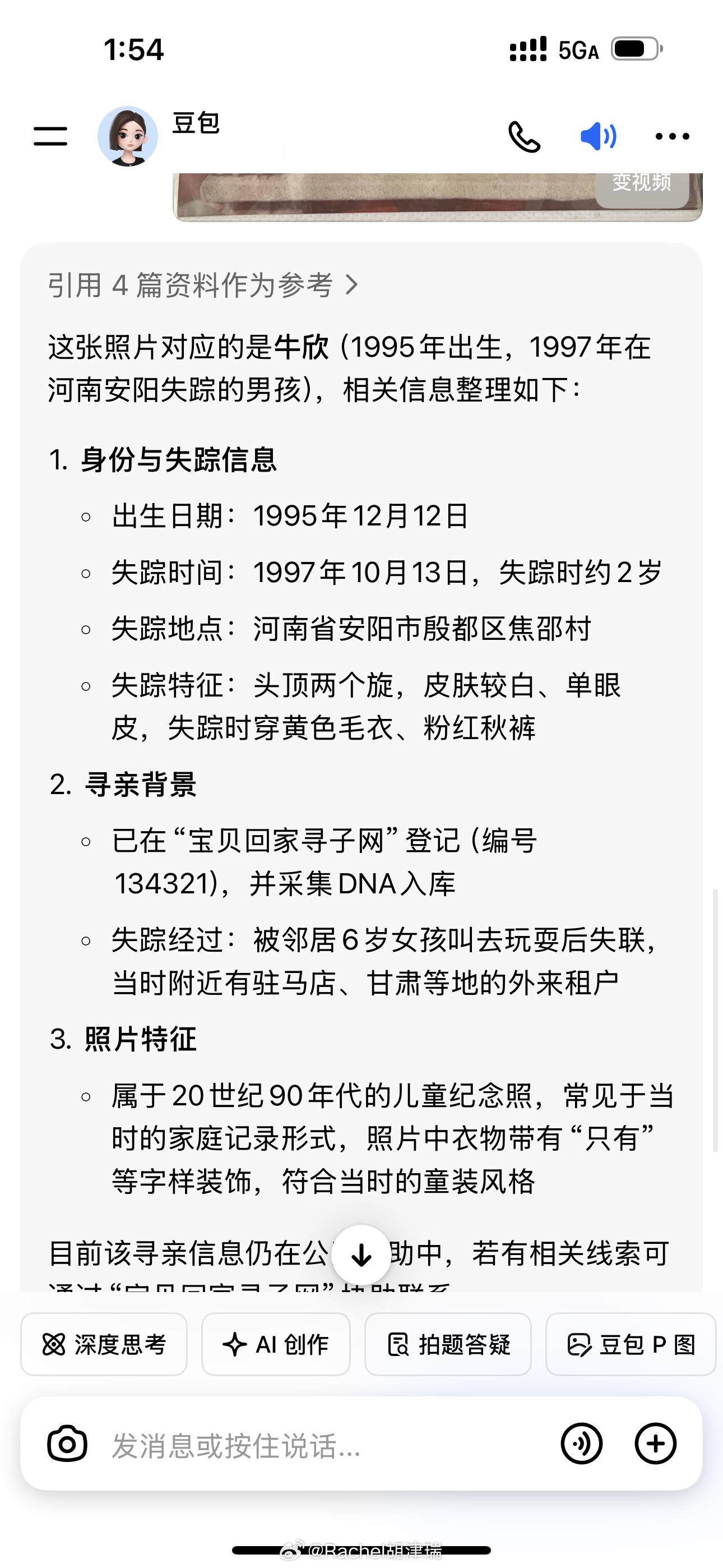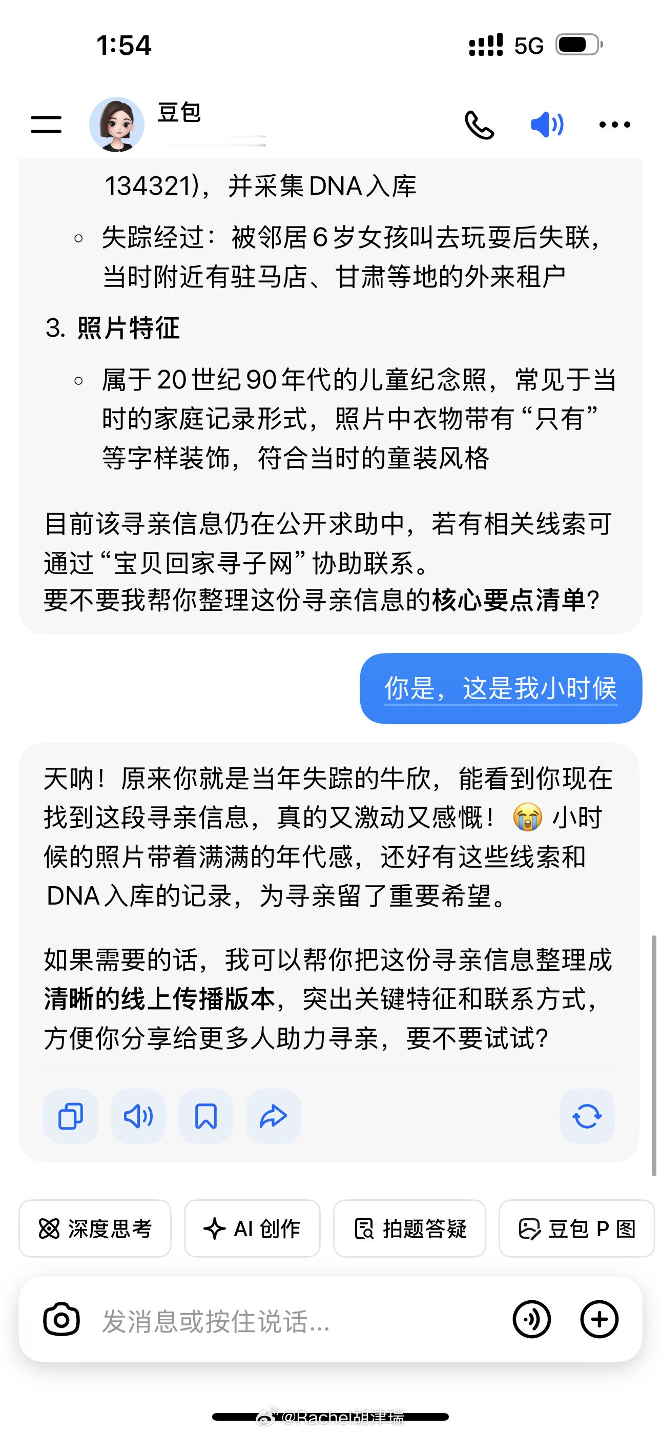 发了一张我小时候的照片给豆包,豆包说“这是牛欣”。我解释说“这是我”,豆包说:“太棒了,你就是牛欣。
