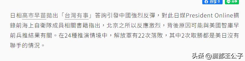 日本媒体又开始拿2023年的美国兵推说事了,说什么中国之所以对高市早苗的言论强烈反弹,是因为在美国的兵推中,中国失败了22次,仅有的2次胜利中还是美日没有联手。 事实真的如此吗? 2023年,美国CSIS做了台海发生战役的兵推,为了让当时的拜登政府满意,于是设定了几个条件。 1、解放军只能出动东部战区的兵力,南部战区和北部战区在旁边看热闹,同时火箭军不能动用东风26等远程导弹,只能使用火箭炮和短程导弹; 2、美日联军拦截解放军导弹的成功率必须高于91%,美军在日本和菲律宾的后勤基地不被解放军导弹摧毁,可以无限的补给弹药。 即便如此,美军最后的兵推也是惨胜,CSIS号称美军会损失500-900架战机,2艘航母,20艘各类型战舰。 解放军自然不可能按照美军的兵推那样绑手绑脚,美国的导弹拦截率也达不到91%。最新的俄乌战场数据,美国“爱国者”防空导弹的拦截成功率只有6%。 日本媒体骗一下自己人就可以了,真以为能骗到所有人吗?