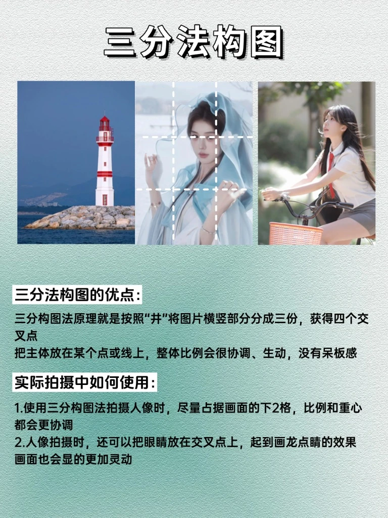 很多小伙伴不知道怎样把照片拍的更好看,其实不一样的构图会让你同一场景下的图片有不同的效果!!