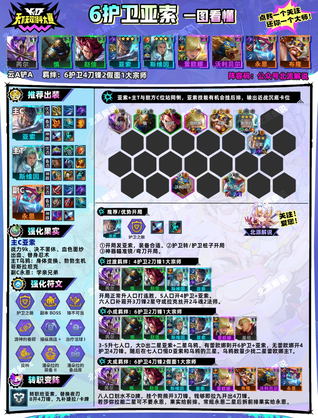 今天为大家补充阵容池,开局糊亚索/护卫转Z/瞄准镜弯刀开可以冲护卫亚索。这套阵容在电一王者局出场率还可以,亚索能三吃分是稳的。想吃鸡需要上九开4刀锋。乌鸦若不能3主T可以选择刚加强过的蕾欧娜。阵容上限是9人口永恩果实拿血亲兄弟增加亚索输出。