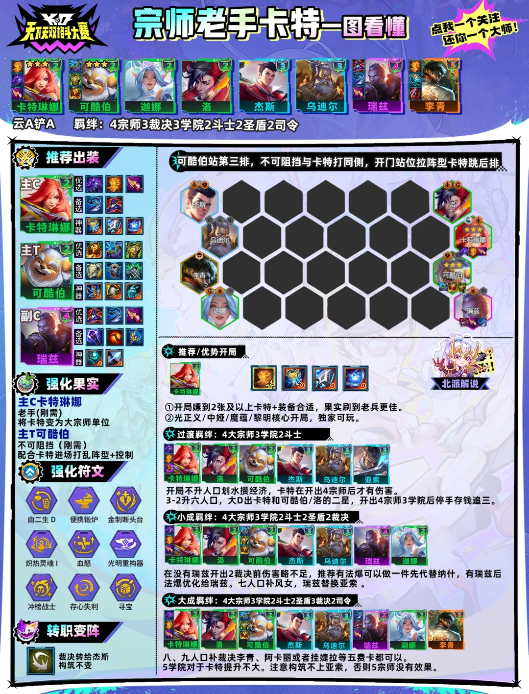 阵容强度:端A铲老手有bug会让羁绊失效,等修复再玩! 阵容玩法核心是此次版本新加入的果实[老手],效果可以让卡特变为大宗师单位并获得增伤,在开出4宗师后额外获得35%双攻加成。改版重做的纳什也非常适合卡特:暴击提供4点回蓝,基础25+纳什20+正义20+2裁决25=90点暴击,上八补出3裁决则100%暴击。加上瑞兹削弱后,需要4宗师的低费赌狗环境好了很多,不用担心找不到瑞兹了。 不要让亚索和瑞兹同时上场!!5宗师会让羁绊失效! 阵容构筑:卡特、洛、可酷伯、杰斯、乌迪尔、瑞兹、风女、李青 组成羁绊:4大宗师3学院3裁决2斗士2司令2圣盾 选择前提: ①开局胡2张及以上卡特再考虑,阵容还是很吃成型速度的,需要卡特尽快三星+找到瑞兹。 ②装备光正义、中娅、魔蕴、黎明核心可以让卡特质变,开局拿到装备确定独家后可玩。 ③符文由二生D开,阵容构筑有4张二费卡,六人口构筑更顺滑,成型后也能稳定一波2次刷新。 千分王者局对阵全3星满质量鱼骨头卡莎↓↓ 卡特发挥上限高下限高,一定要对到位!! 果实推荐: 卡特:老手(刚需) 效果前排已经介绍了,重点是不要上多宗师开成5宗师,有瑞兹后丢掉亚索是最好的。 可酷伯:不可阻挡(刚需) 可酷伯+不可阻挡的搭配原理同宗师船长,近战刺客C搭配可酷伯技能和不可阻挡的控制来打乱阵型,让卡特更好切到后排。 若洛先三星,可洛带前排装+不可阻挡,有一个T三星后升人口补风女找瑞兹。 装备推荐: 主C卡特:正义+夜刃+纳什 核心装正义和夜刃必备,保证了吸血、生存和伤害。在没有瑞兹前有多余拳套可以合成法爆先用(没瑞兹开不出裁决,技能无法暴击),有瑞兹后纳什替换法爆,法爆给瑞兹用。 神器推荐:中娅(代替夜刃)魔蕴/黎明核心(代替纳什) 光装备:优先找光正义,其次光巨杀/光纳什 主T可酷伯:日炎+离子+狂徒/冰甲/石像鬼/振奋 核心装离子必备,不可阻挡配合卡特可以给后排挂到减魔抗威胁后排,瑞兹的法穿棒则不能。重伤虽然乌迪尔会提供,但阵亡后重伤立即消失,最好是做一个(重伤不嫌多),也可以是后排的红/鬼书,可酷伯第三件选择常规前排装或启动装都可以。 副C瑞兹:帽子+纳什+巨杀 日常捡破烂,如果是先给卡特做法爆拆给瑞兹,优先去搭配纳什。另外巨杀新版本加强很多,非常适合打前排平推的输出C。