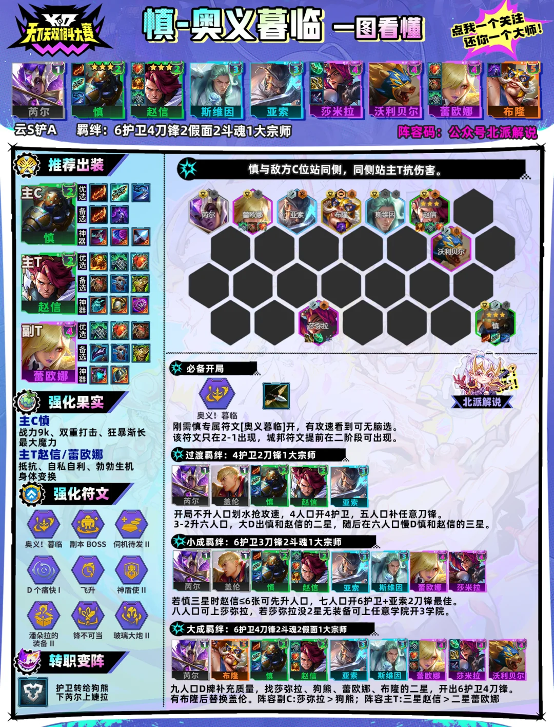 阵容强度:端S铲没测试 慎的专属玩法在15.4版本获得了加强,现在的专属强度都不差,拿到=捡分,尤其是副C莎弥拉的加强为阵容后期补充了输出不足的缺陷,大数据慎专属的平均排名已经超越莎龟和天才龟,排名第四位。 这拉面师傅...好像玩了几个赛季... 阵容构筑:芮尔、慎、赵信、亚索、乌鸦、蕾欧娜、莎弥拉、狗熊、布隆 组成羁绊:6护卫4刀锋2假面2斗魂1大宗师 阵容二星莎弥拉>二星永恩。永恩在15.4版本刚削弱了攻速,现在是5费卡垫底的存在;而莎弥拉刚经过大加强,同时还能和主T赵信开出2斗魂羁绊。 选择前提: 刚需慎专属符文[奥义!暮临],该符文只在2-1金色符文刷出,有符文提前城邦可在二阶段出现。 开局有攻速无脑选,没什么好定阵方向也可以拿了卖三波血去拿攻速。 果实推荐: 慎:战力9k(最大阶段2)、双重打击、狂暴渐长、最大魔力(最大阶段2) 战力9k刚经过加强,开局可以拿,中期发现攻速/法强属性给的少可以换。另外开局可拿的果子是最大魔力(慎技能护盾的ap加成,而专属将护盾值转化为真实伤害) 赵信/蕾欧娜:抵抗、自私自利、身体变换、勃勃生机 赵信不能三则果实给二星蕾欧娜,阵容需要前排果实拖时间,不要给莎弥拉大果。 装备推荐: 主C慎:羊刀+科技枪+巨杀/羊刀 核心装羊刀必备,第一把攻保羊刀,第二把攻巨杀/羊刀有啥做啥。科技枪因为不消耗攻速也是慎的好装备。另外可选的是夜刃,在残局后排扯头发有奇效。 神器推荐:迅刃(搭配羊刀/巨杀/科技枪三渲二)智慧末刃(代替科技枪)狙击手/电刀(搭配羊刀+科技枪/夜刃) 主T赵信:日炎+心之钢+振奋/狂徒/反甲/冰甲 阵容后排没有优质挂重伤单位,前排日炎为刚需。另外赵信技能自带回复,心之钢是很不错的装备。 其余装备分配: 第二套前排装给副T蕾欧娜,大剑/拳套做副C莎弥拉的装备。后期选择给布隆拿夜刃和蓝量装。狗熊不吃装备,只配带偷偷。 蕾欧娜:心之钢、振奋、狂徒、反甲、冰甲、龙牙 莎弥拉:无尽、青龙刀、蓝霸服、轻语、破防、巨杀、正义 D牌思路: 3-2升六人口大D赵信和慎的二星,随后在六人口慢D慎和赵信的三星。 若慎三星时赵信≤6张可以先不D,优先上人口开羁绊。 开局思路: 非羊刀开局前期不升人口,先划水三波保个羊刀。 四人口上4护卫,五人口补霞/亚索开2刀锋羁绊。