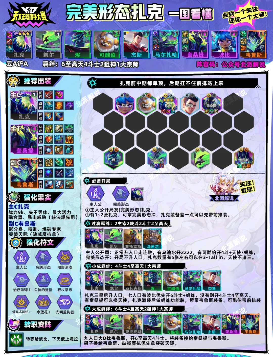 完美形态开局:开局不升人口。天使不追三不做装备,留斗士牌+至高天牌。扎克数量多在3-1卡四人口all in,扎克数量少在五人口慢D三星。