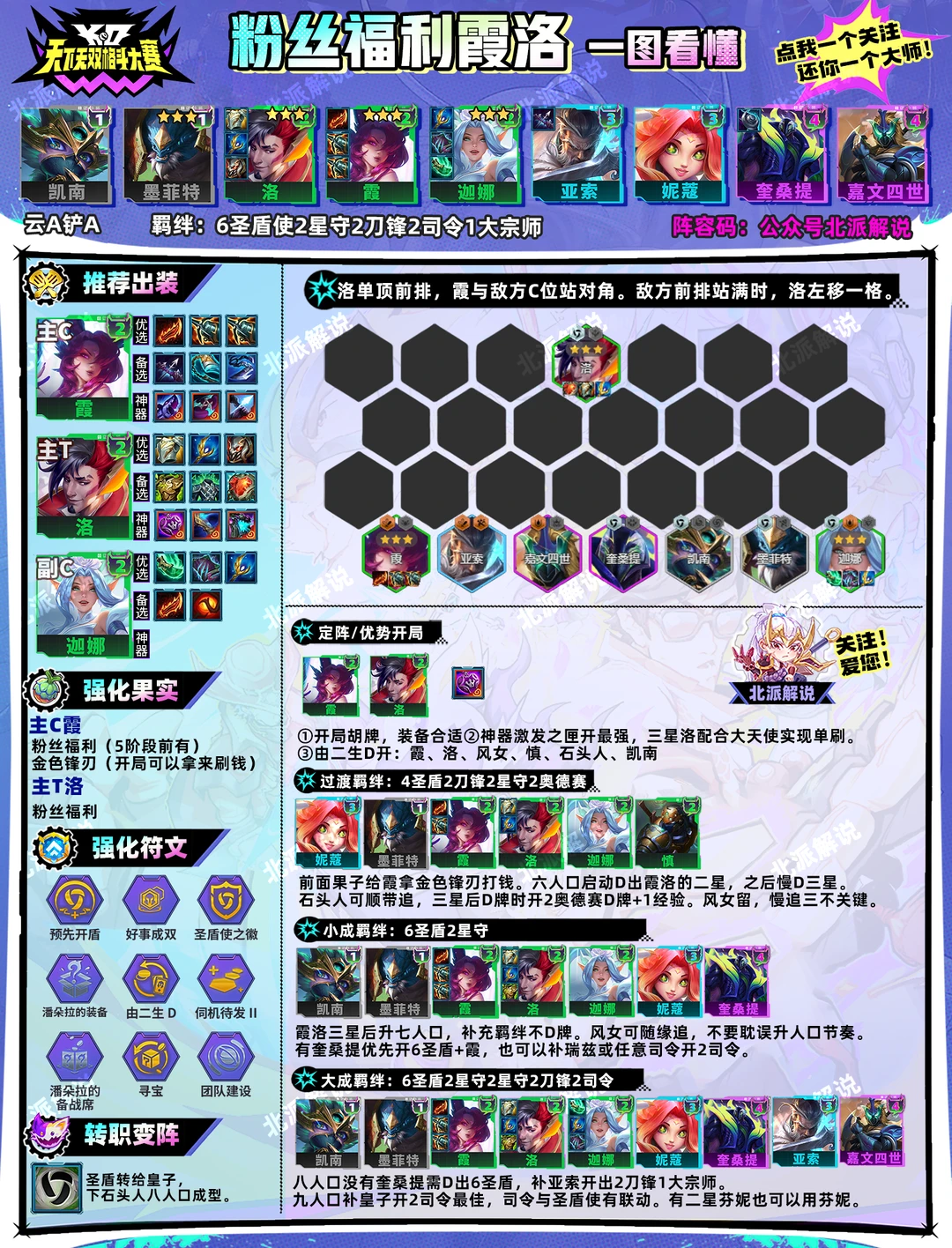 阵容强度:端游A铲A 阵容构筑:凯南、石头人、霞、洛、风女、妮蔻、亚索、奎桑提、皇子 组成羁绊:6圣盾使2星守2刀锋2司令1大宗师 霞在15.3版本获得巨大加强,端游霞玩法以霞&洛搭配6圣盾为主,6护卫霞的玩法在端游是个陷阱,仅限铲玩。霞洛玩法平均排名3.63,同时出场率很低,很适合拿来偷分。 专属果实[粉丝福利]在霞洛三星的情况下,霞能获得45%攻速+45%攻击力,洛能获得900生命值+45双抗,这远比果实机制25%的预期提升高得多,简简单单数值的美.. 与其他高坚果+豌豆射手阵容不同,是洛在6圣盾的情况下,即使霞被伤害偷死,洛依靠大天使叠到后期的法强加成回血和法强加成的aoe,也能完成残局收割。 定阵思路: ①洛毕业神器激发之匣开; ②符文由二生D开:六人口霞+洛+慎+风女+赵信/凯南+拉克丝/妮蔻 ③圣盾专属符文预先开盾/圣盾转。 ④好事成双:霞x2+洛x2+亚索+风女(六人口),七八人口补4圣盾,九人口风女x2。 ⑤开局胡霞洛,装备有攻速,D牌符文开或装备符文开更佳。 果实选择: 霞洛果实均选择粉丝福利,注意果实仅在5阶段前刷出,胡牌刷不到缺拆卸可以拿一星的给果实,刷不到就卖掉。 贪的玩法是第一个果实给霞拿金色锋刃,第二个果实给洛拿到粉丝福利后,再刷出霞的粉丝福利。 装备推荐: 主C霞:核心装备羊刀+海妖,与护卫霞不同,粉丝福利提供的攻速够多,第三件最优为双海妖,备选巨杀、科技枪、轻语、破防。 神器:迅刃、瞄准镜(搭配羊刀海妖)、迅刃(代替羊刀、前排洛最好的是激发之匣(搭配大天使石像鬼) 主T洛:核心装备石像鬼+大天使。洛的伤害和回血都是ap加成,是后期坦度的保障。第三件泰坦免控、狂徒加血、振奋回血、心之钢减伤都可以。 副C风女:大天使优先级最高,其次鬼书/红霸服挂重伤,再搭配启动装青龙刀/羊刀。 阵容破甲薄暮给副T奎桑提,轻语给亚索。 前期运营: 第一个果实给霞,有金色锋刃推荐拿金色锋刃刷钱。没三星前的粉丝福利提升不大。 前期用4圣盾+霞过渡,没有4圣盾则2圣盾+2刀锋+2护卫过渡。 中期D牌: 3-2启动D牌,先D出霞和洛的二星,随后在六人口慢D霞、洛、风女的三星。 构筑4圣盾+霞+亚索/二星慎 。石头人顺带追,可以卡一手石头烬,若石头人三星,D牌时开2奥德赛每次D牌能+1经验。