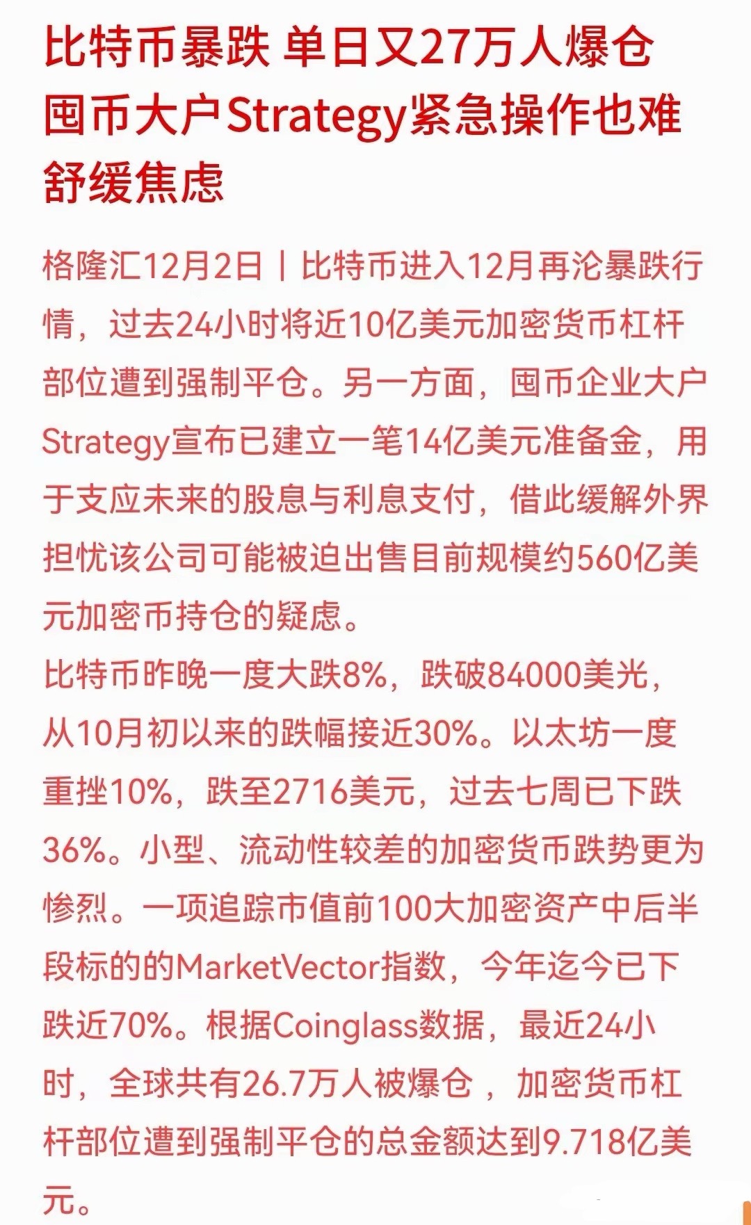 比特币玩家真是太惨了,一晚上就有27万人出现了爆仓昨晚,比特币再次出现了暴跌的情况,盘中一度跌破了84000美元,最终跌3.8%。仅仅昨天一天就有27万人爆仓,其中以多单为主。比特币从12.6万美元跌下来,到现在的8.6万美元,已经跌了30.2%,可谓真是站的越高跌得越惨。此次下跌的主要原因是日本进入到了加息周期当中,日元开始走强,成为货币紧缩的信号,放水减少,加密货币出现了抛售的情况。日元是世界第二大储备货币,仅次于美元,所以日元的加息会很大影响货币的流通。