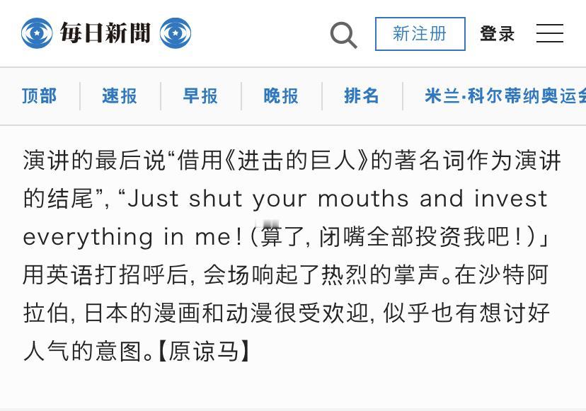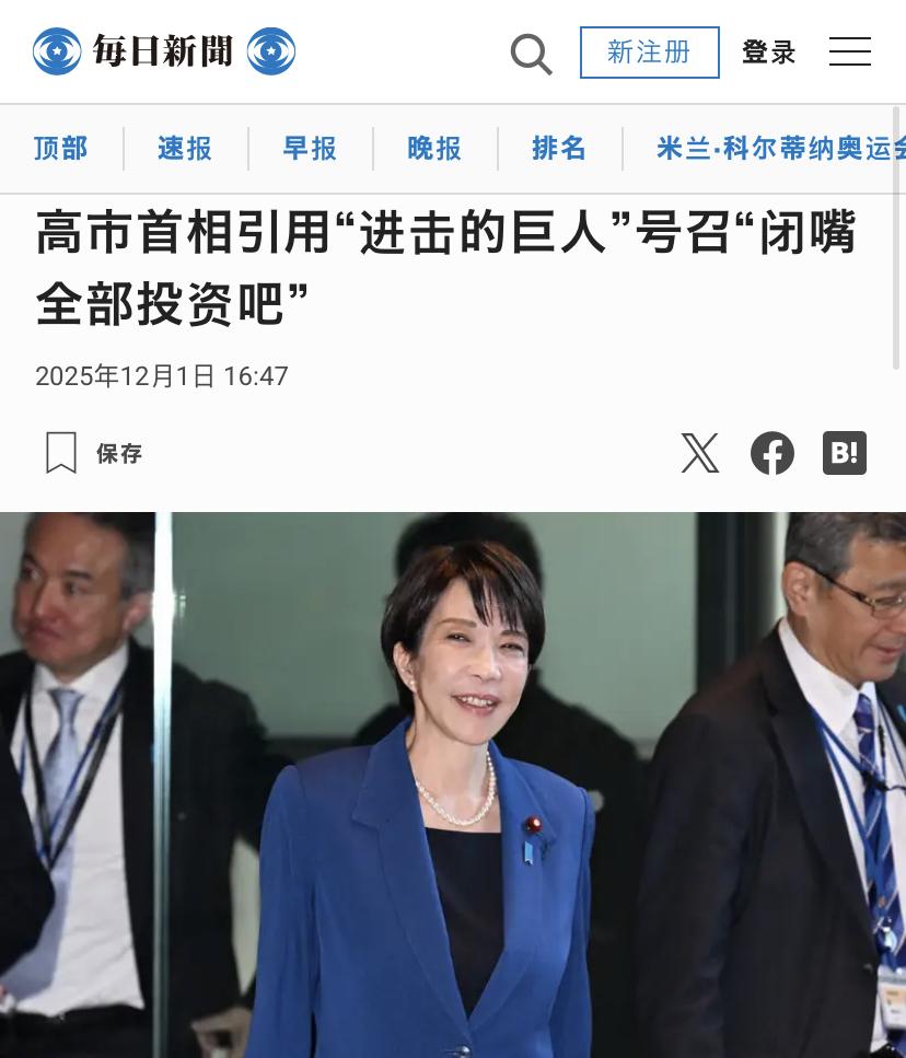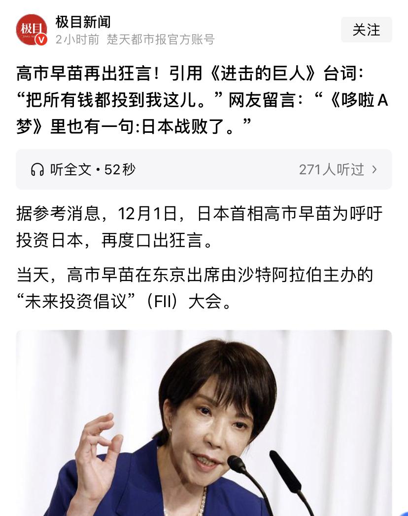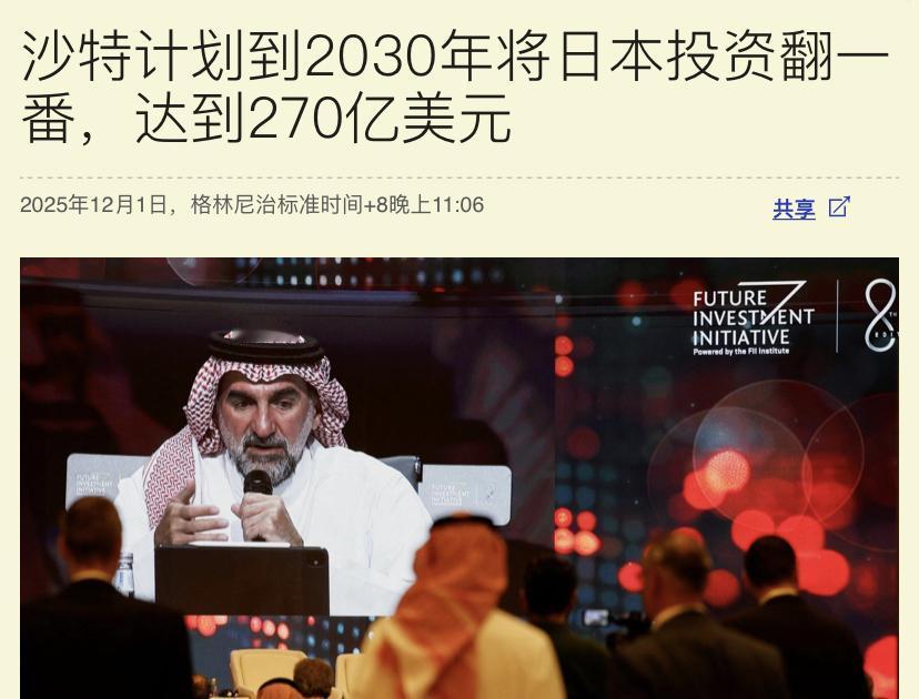 高市早苗口出狂言?[灵光一闪] 木叔20多年来一直关注和报道中东,对沙特与日本近来的关系很感兴趣。12月1日,沙特为纪念与日本建交70周年,在东京组织了一个投资论坛,邀请高市早苗主旨演讲,高市早苗引用日本漫画的一段话做结尾,呼吁到日本投资。 媒体报道,这个效果很不错,沙特人很高兴,热烈鼓掌,因为谁都知道这是玩笑,而且沙特人很多都喜欢日本漫画,这等于传播了日本漫画。 我们官方媒体在报道这件事的时候,显得过于刻板了,说高市早苗口出狂言,好像沙特也反日。这是感受不到现场气氛、只是从字面理解的人写出来的报道。 其实日本媒体说,沙特人和现场来宾没有觉得不妥,沙特主权基金负责人在论坛上还说要增加对日本一倍投资。