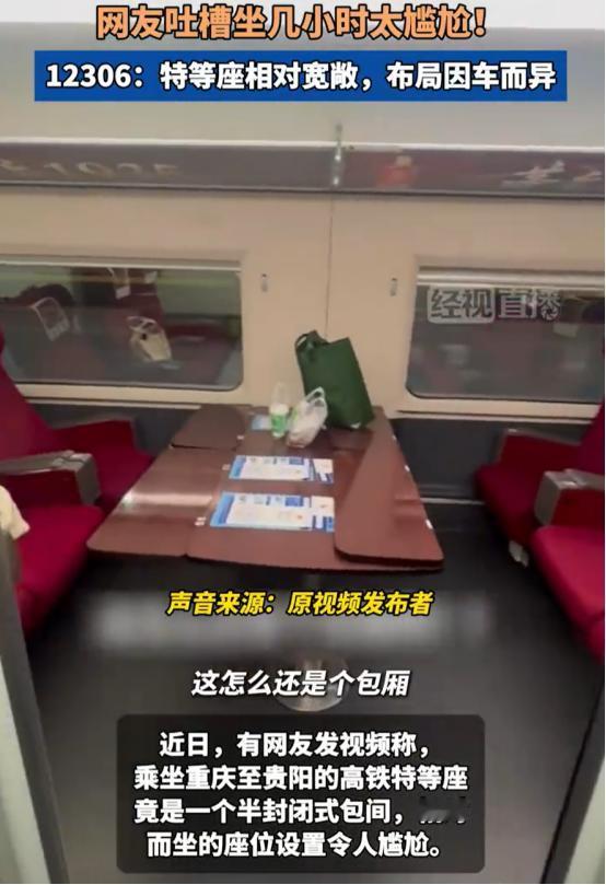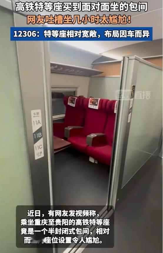 “太尴尬了!”男子出门乘坐高铁,为了乘坐的更舒适,特意多花几十块钱买了张特等座,没成想,上车找到座位后,却发现是一个半封闭的小包厢,座位都是相对而坐,每经过一站,男子都在祈祷没人上车。   11月底,张先生(化姓)特意花高价,买了重庆开往贵阳的高铁特等座,结果发现自己被关进了一个能自动关门的小包间里。没排三个座位相对而坐,网友们看到后都忍不住笑了,调侃这哪里是特等座,分明是个“高铁会议室”啊。   但张先生本人可笑不出来。他本想着花费500多元买个特等座,能换来更舒适、更安静的旅途也值了,可没成想现实竟然和自己想象中宽敞、私密的独立空间大相径庭,不仅座位拥挤,面对面的布局也是让人尴尬的脚趾扣地。   这种花了高价却买来的“如坐针毡”的感觉,让张先生深感不值。尤其当他知道,这张特等座的价格竟然比同车次的商务座还要贵出三十块钱时,那种消费落差更是不言而喻。   事件引发热议后,12306客服的回应道出了一个很多普通旅客并不知晓的实情:高铁特等座的布局并非统一,而是因车型不同而有巨大差异。但对于大多数普通乘客来说,大家旁边认为“特等座”“商务座”这些名称所代表的,理应是更加舒适,服务更好的车厢。   因此,这件事的核心矛盾,并非单纯是座位面对面设计的好坏。这种布局本身或许适合结伴出行的家庭或团队,但对独自出行的旅客确实可能造成困扰。更何况,乘客还为此支付了更高的票价。   如今,高铁服务在不断提升,也越来越追求多元化,这本是好事。但需要注意的是,当乘客感觉自己多付了钱,却没有换来对等的、甚至更差的体验时,不满自然会滋生。   在高铁庞大而复杂的运营体系中,想要满足所有旅客的个性化需求,确实是一项艰巨的挑战。然而,在技术手段日益发达的今天,弥合信息差、提升服务精准度的可能性同样也变大了。   如果能在购票环节,通过页面提示、座位示意图等更直观的方式,明确告知旅客某趟车特等座的具体布局形式,那么很多不必要的尴尬和投诉完全可以在买票时得以规避。这并非苛求,而是让高铁服务变得更有温度、更值得信赖的一种努力。   一趟高铁旅程,是现代人生活中再平常不过的片段。这个发生在重庆至贵阳列车上的小插曲,则反映出高铁服务有待进步的空间。对此你有什么看法?欢迎在评论区留言讨论。高铁特等座 高铁服务   信息来源: 中华网新闻2025-11-30|高铁特等座面对面包间被吐槽尴尬 布局差异引热议 文|墨海 编辑|史叔