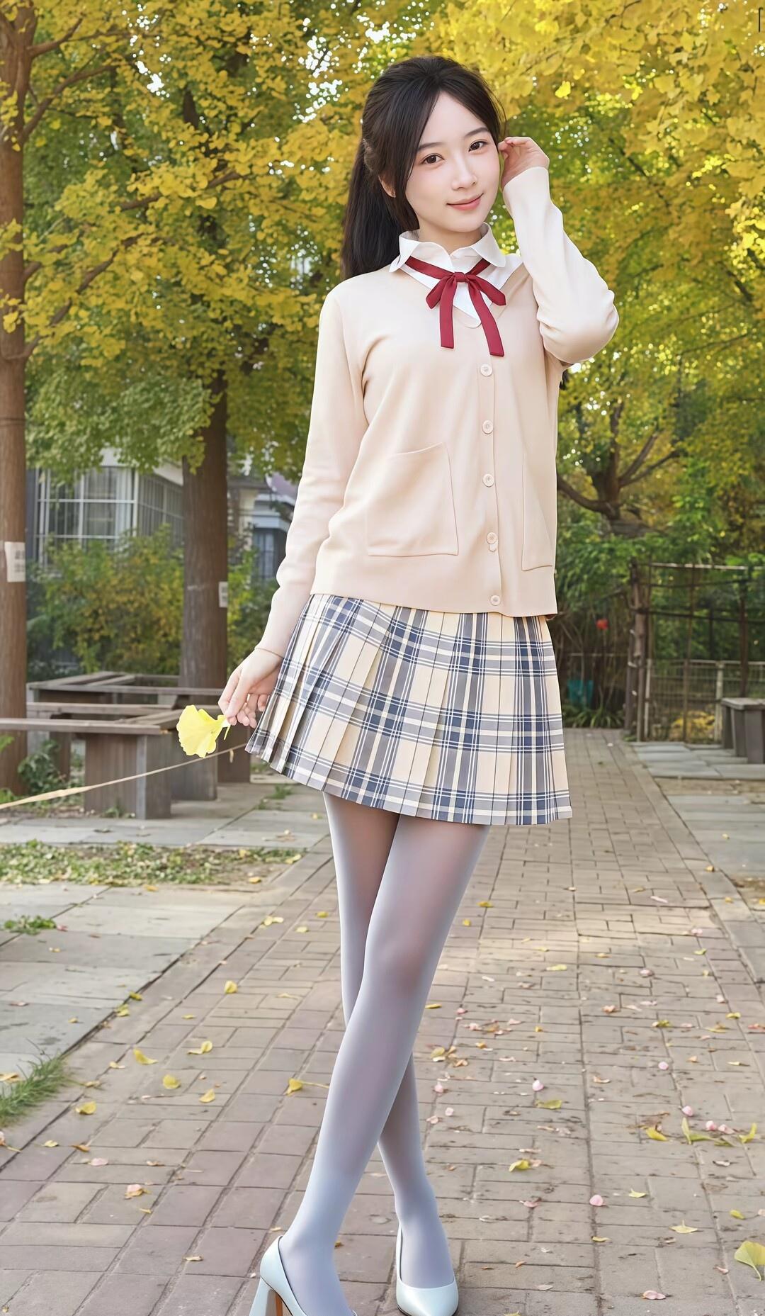 秋日校园少女,红领巾与格子裙的完美搭配,阳光洒满的午后,青春洋溢