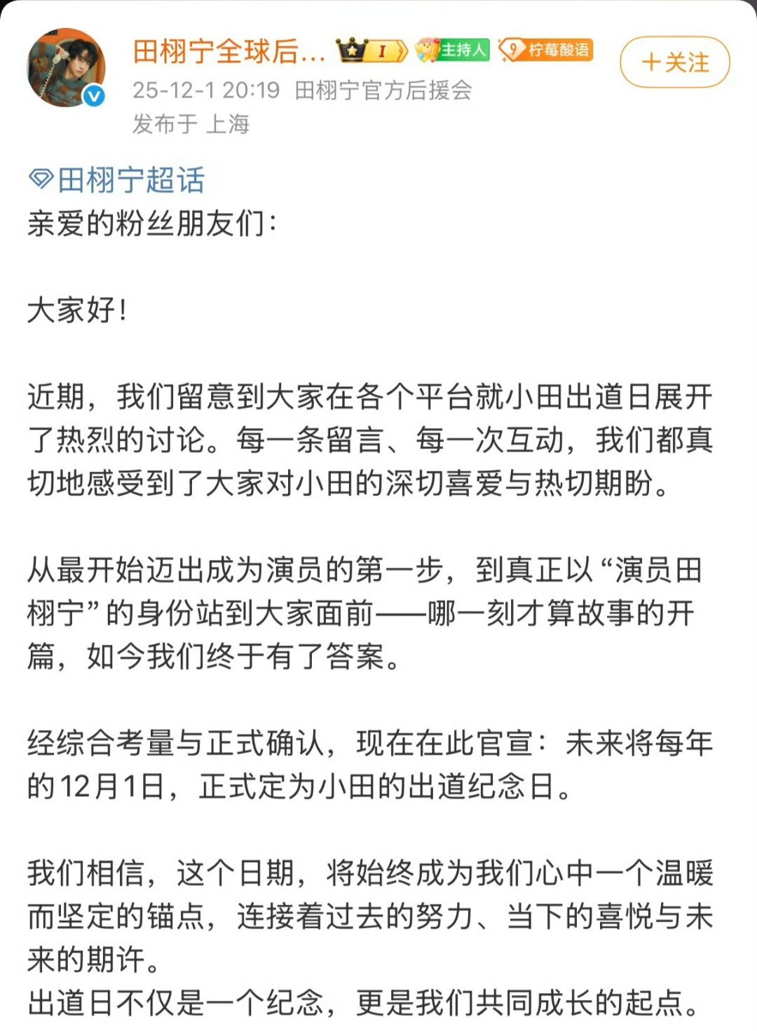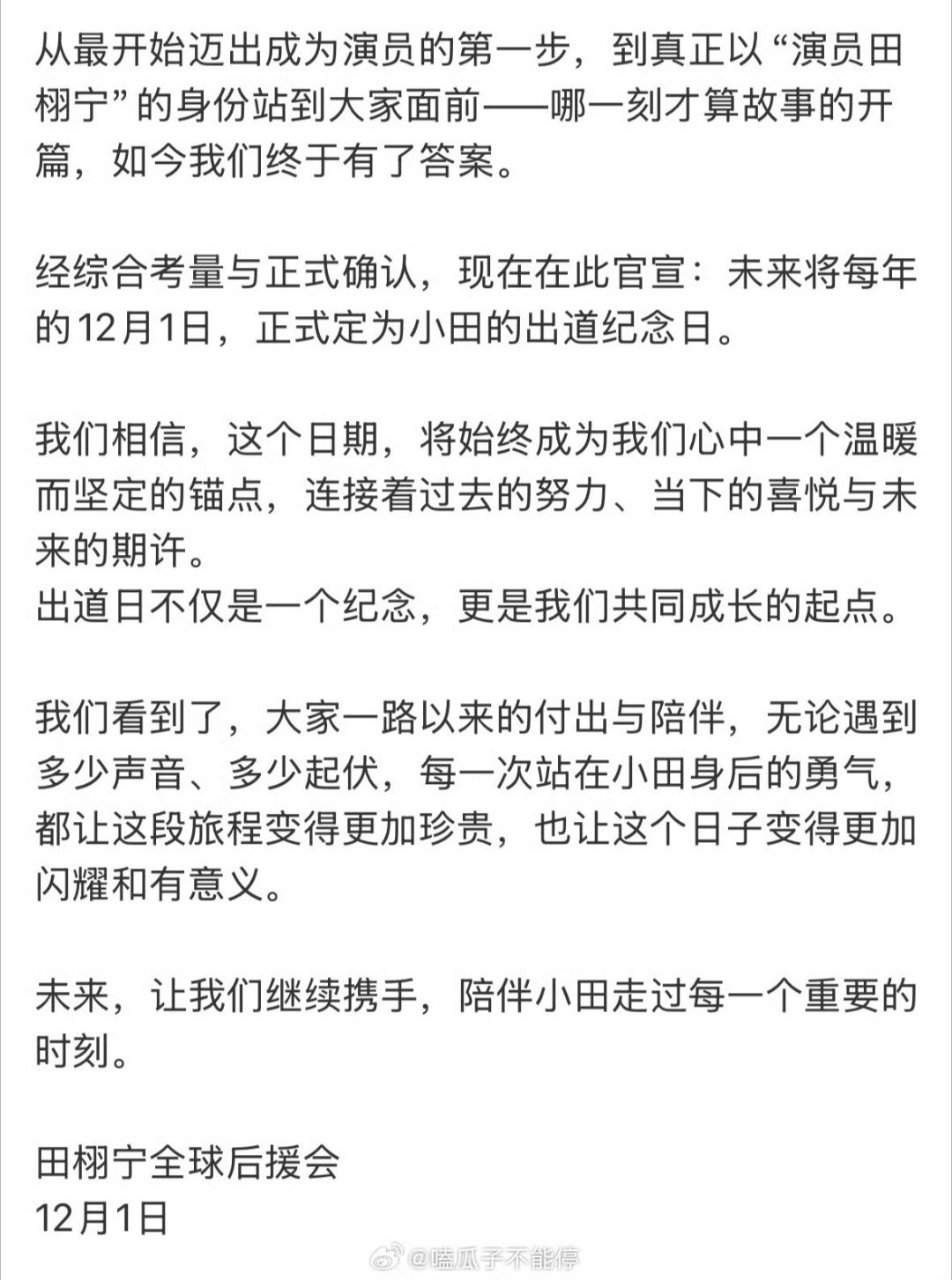 田栩宁粉丝把每年的12月1日定为田栩宁出道纪念日很用心的安排