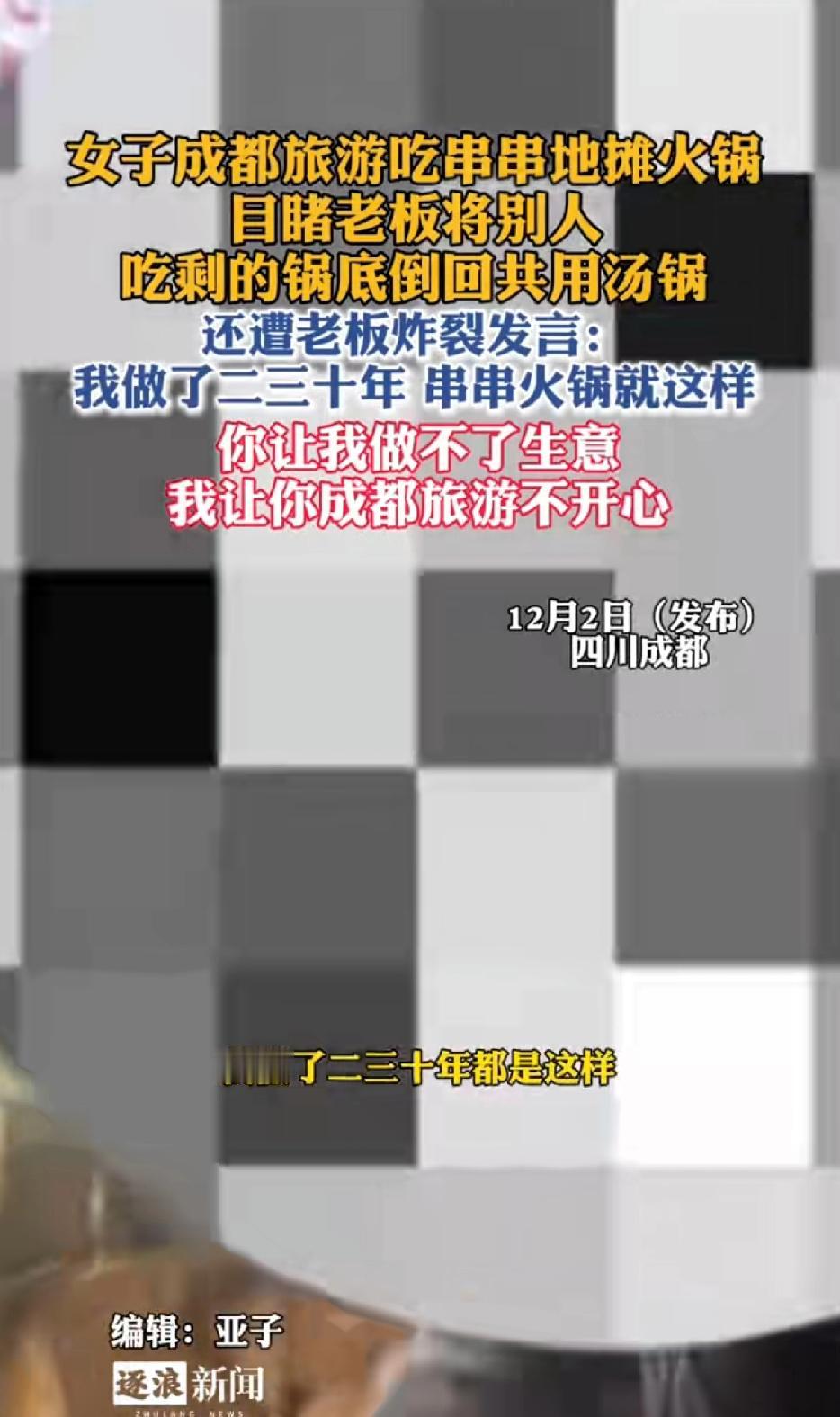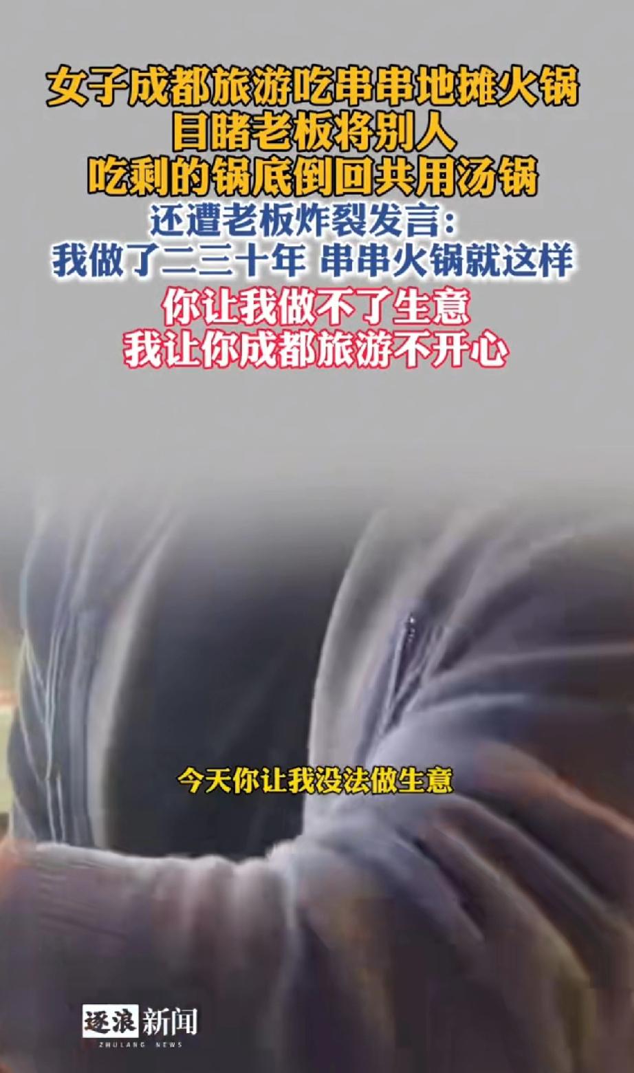 两名女子成都旅游吃地摊串串火锅,目睹老板将别人吃剩的锅底倒回公用汤底。 还遭老板炸裂发言:我做了二三十年串串火锅就是这样操作的。 你让我做不成生意,我让你俩成都旅游玩的不开心。 这老板太牛逼了吧!公然的威胁别人。 吃的都是别人吃剩的锅底,还怎么开心。吃到这样的火锅遇到这样的老板,原地不动就不会开心。 好好的出去旅个游,吃饭恶心人,莫名其妙得被威胁,现在都不是开心的事了,而是人身安全问题。 女博主应该把店名和地址发出来,避免更多人吃剩菜。 自预制菜出现后,大家对外出吃饭都很小心,没想到这么吃个串串火锅还有这样的操作,也算给大家上一课。 吃剩的锅底反复倒回去再利用,还不如吃预制菜,一个不新鲜,一个压根就是太多人的口水混合在一起。 本来想着吃个火锅能有多不卫生?菜都是生的,也不用煎炒烹炸,肯定吃炒菜要卫生。 谁知道大雷原来在火锅底料。 老板这样做非但不觉得有问题,反倒觉得理所当然,明明想害人却还要花钱开个饭馆。 扬言自己这样干了二三十年了,多可怕。 以前说做医生要有医德,现在开饭馆也要讲究品德了。