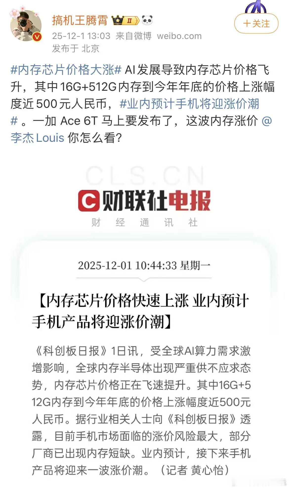 2799?一加 Ace 6T这波同档位真是绝杀了!昨天内存芯片价格大涨的消息一出,就有博主追问一加 Ace 6T 到底会不会涨,李杰三个字“太难了”,可以说直接点透了一加 Ace 6T的核心压力——一边是上游存储芯片涨价的硬成本,一边还得扛着旗舰配置全面升级,这成本压力真就压到嗓子眼了啊!从目前官宣信息来看,一加 Ace 6T 的配置是真没含糊,当代旗舰芯片骁龙8 Gen5、8300mAh 冰川电池、165Hz 高刷屏、满级防尘防水、超声波指纹……硬件条件属实是全面定位“Pro”,如果2799的定价是真的,这个价格可比去年档期一加 Ace5 Pro还要香,可以直接冲!蹲一手明天的发布会,看看到底香不香!
