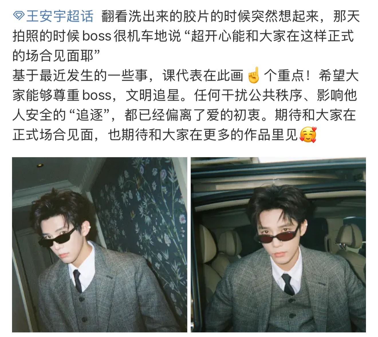 王安宇方回应了被追车的事。说希望大家尊重王安宇,文明追星,不要干扰公共秩序,影响他人安全。期待在正式场合和更多作品里见面。王安宇方呼吁文明追星