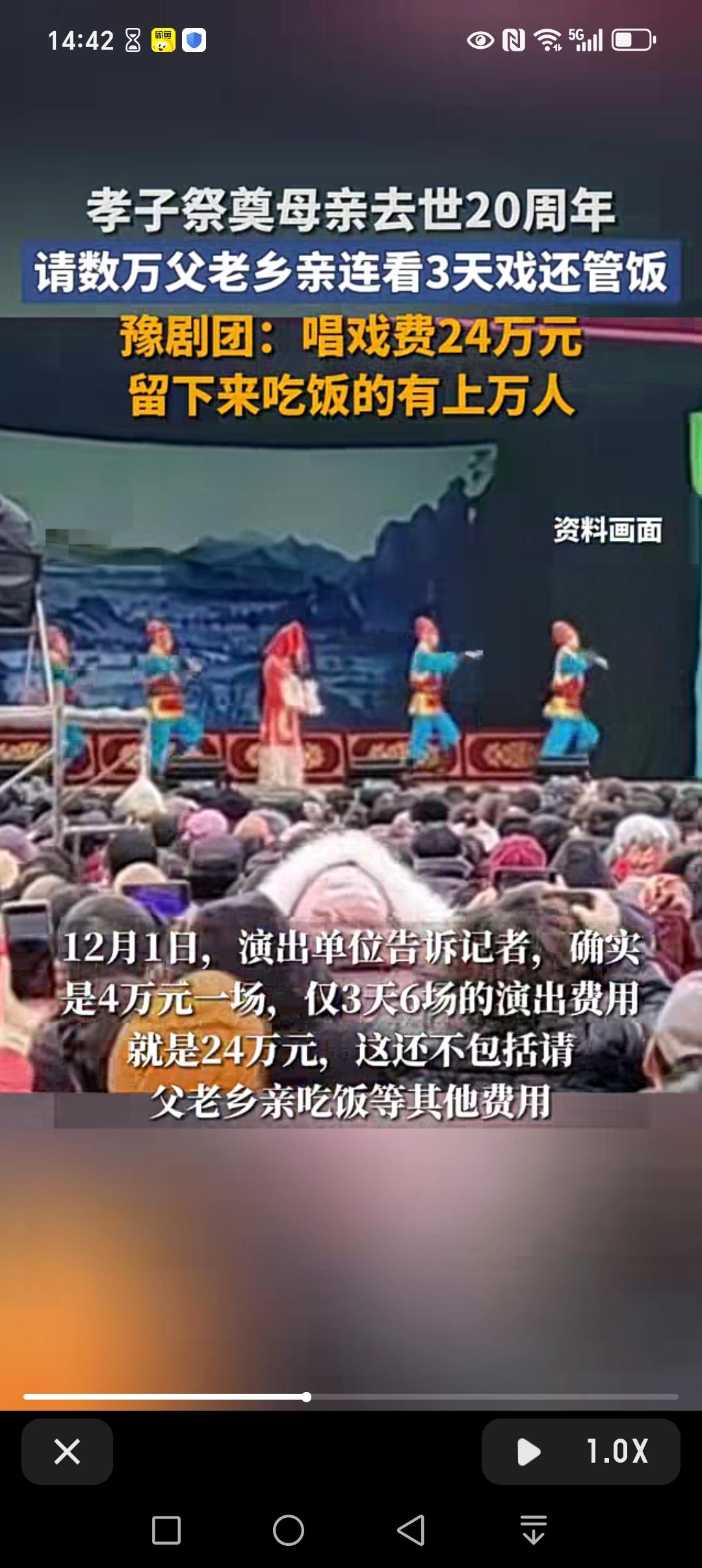 一孝子在祭奠其母亲去世20周年时,请数万名父老乡亲连看3天戏,还管饭。 这两天,许多网友发视频显示:河南安阳市马河涧镇元二庄村有孝子为母亲祭奠时,用了3天时间一共唱了6场戏,每场费用4万元。仅豫剧团唱戏费开支就达24万元,还不包括请父老乡亲吃饭等其他费用。12月1日,演出单位已向记者证实了此事。 有网友看了此帖后,认为花这么多的钱请父老乡亲又是看戏又是吃饭的,还不如把这钱花在公益上,像造桥铺路,资助贫困学生等。 也有网友认为,此举只是孝了…是大善人…回报社会了… 还有网友说,用给母亲尽孝养万人,这是善举! …… 友友们,你们是怎么看待这件事的?评论区说说你的看法? 截屏网图,侵删!个人观点,仅供参考!