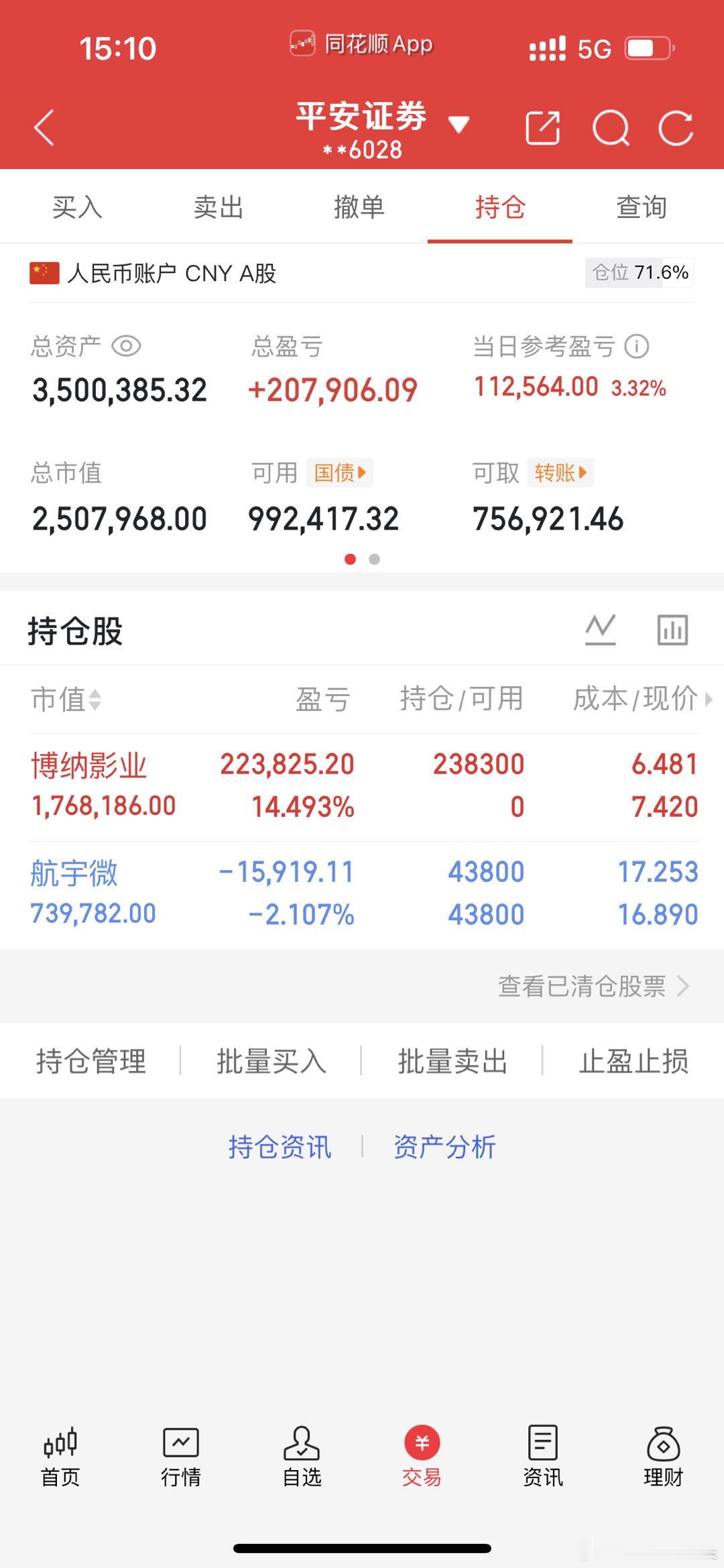 收盘啦,今天早上做了个踢后面涨停啦,博纳居然炸板了,不过还好没有跌破开盘价,航宇微今天一直在水下我也没有动!明天看看再决定怎么操作!今天盈利11.2万,这个行情赚钱也是非常开心啦,兄弟姐妹们点赞评论888庆祝一下