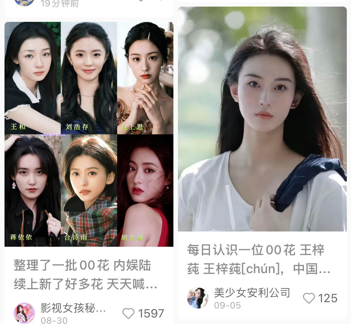 咱莼姐的自信不是没有原因的大家都嘲笑王梓莼自称00花,一些营销号盘点00花还真带过她。有时也不怨人家那么自信,高中时就被一群男粉一口一个校花一口一个女神捧着,很难不自信啊王梓莼 00花