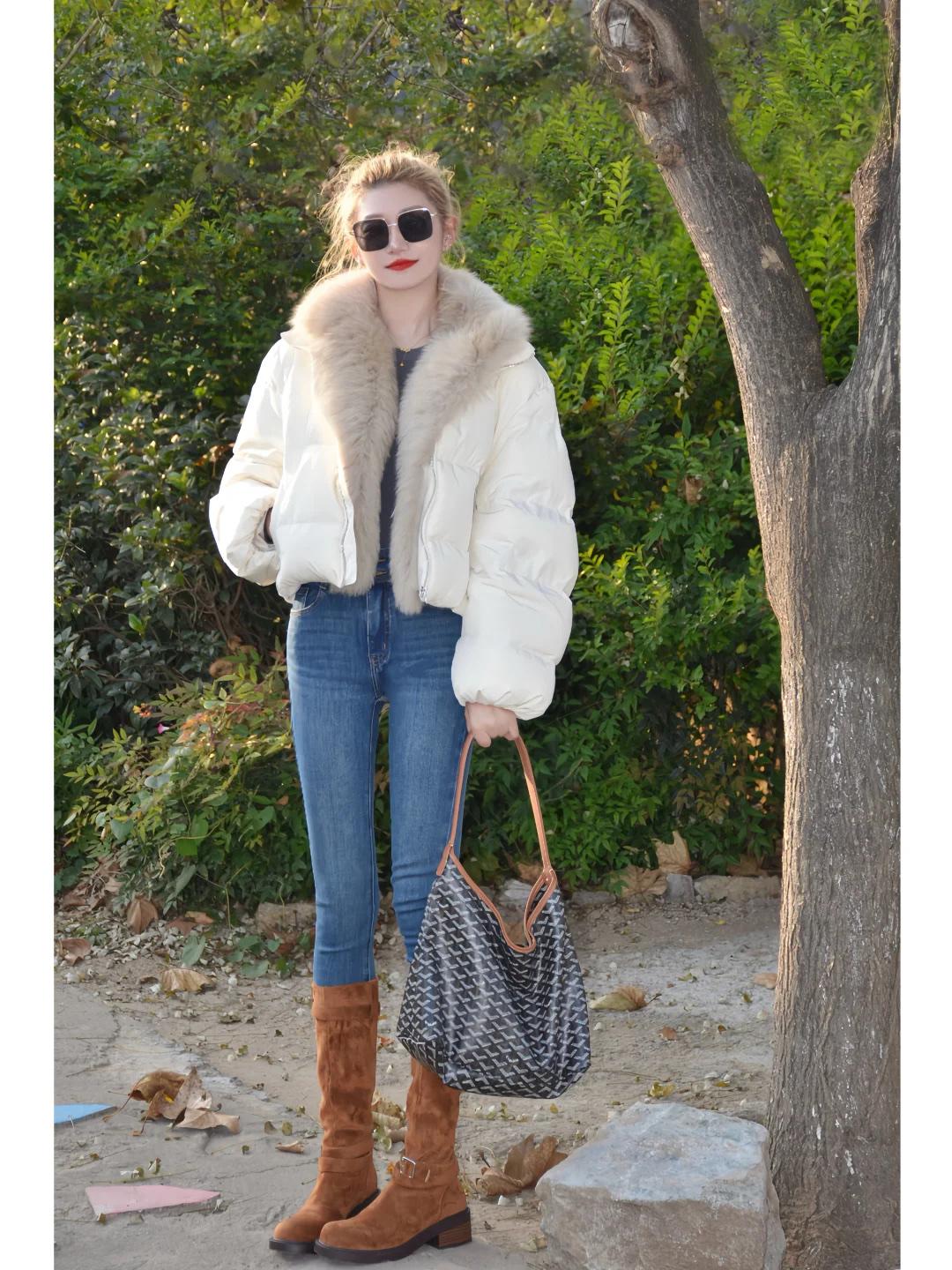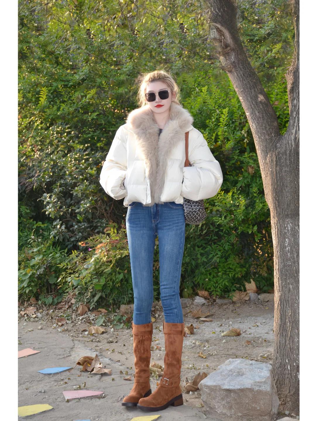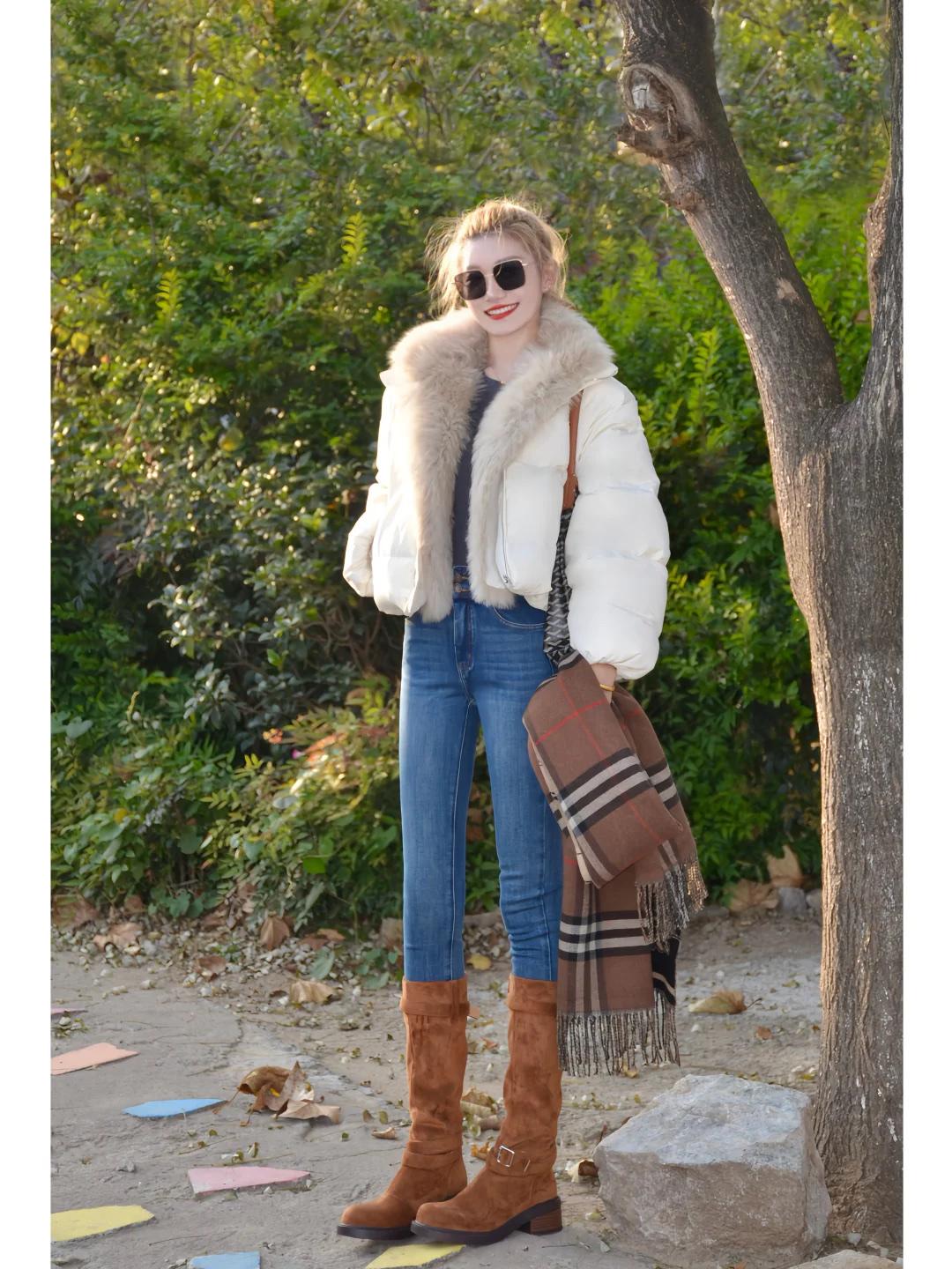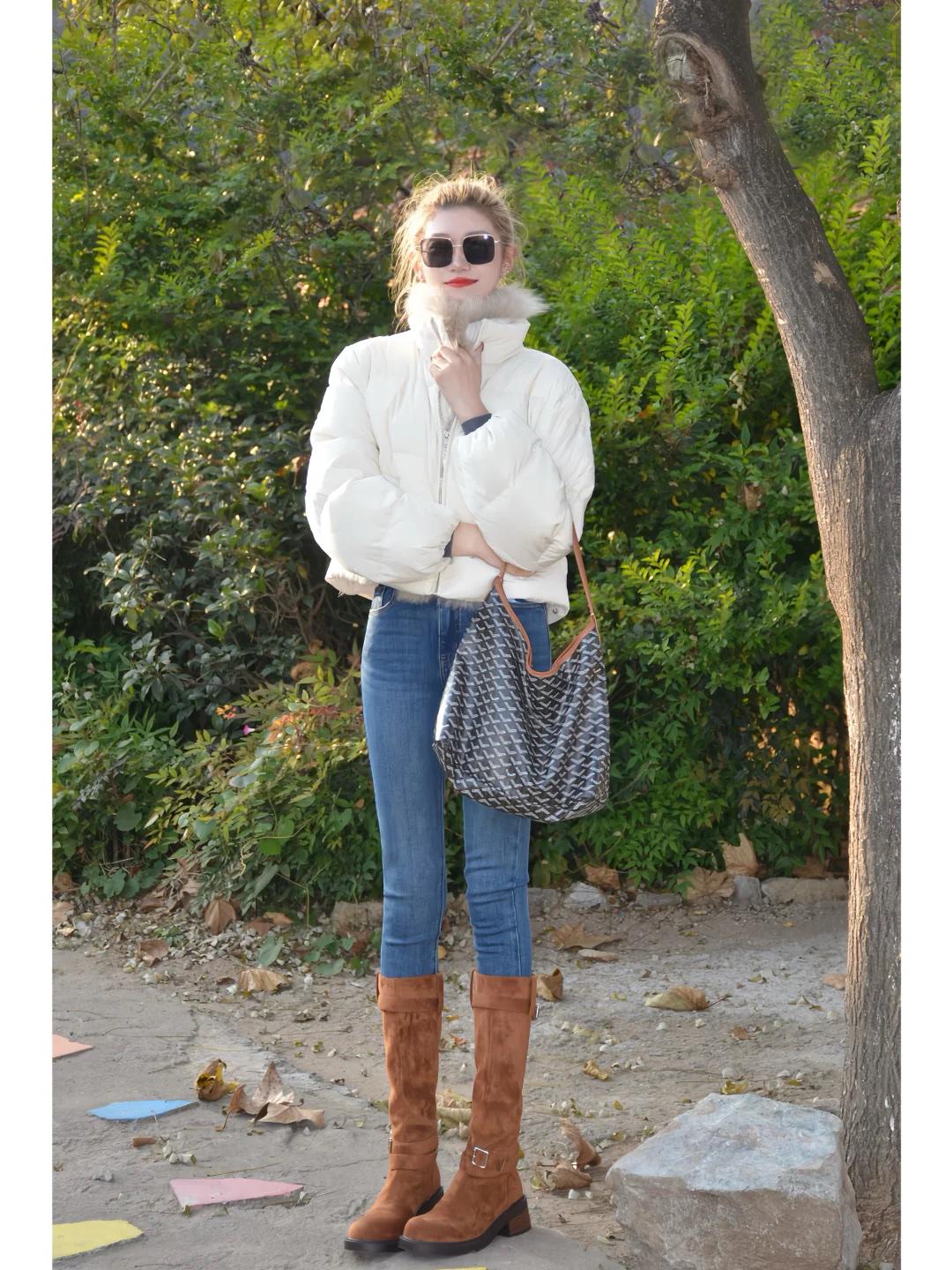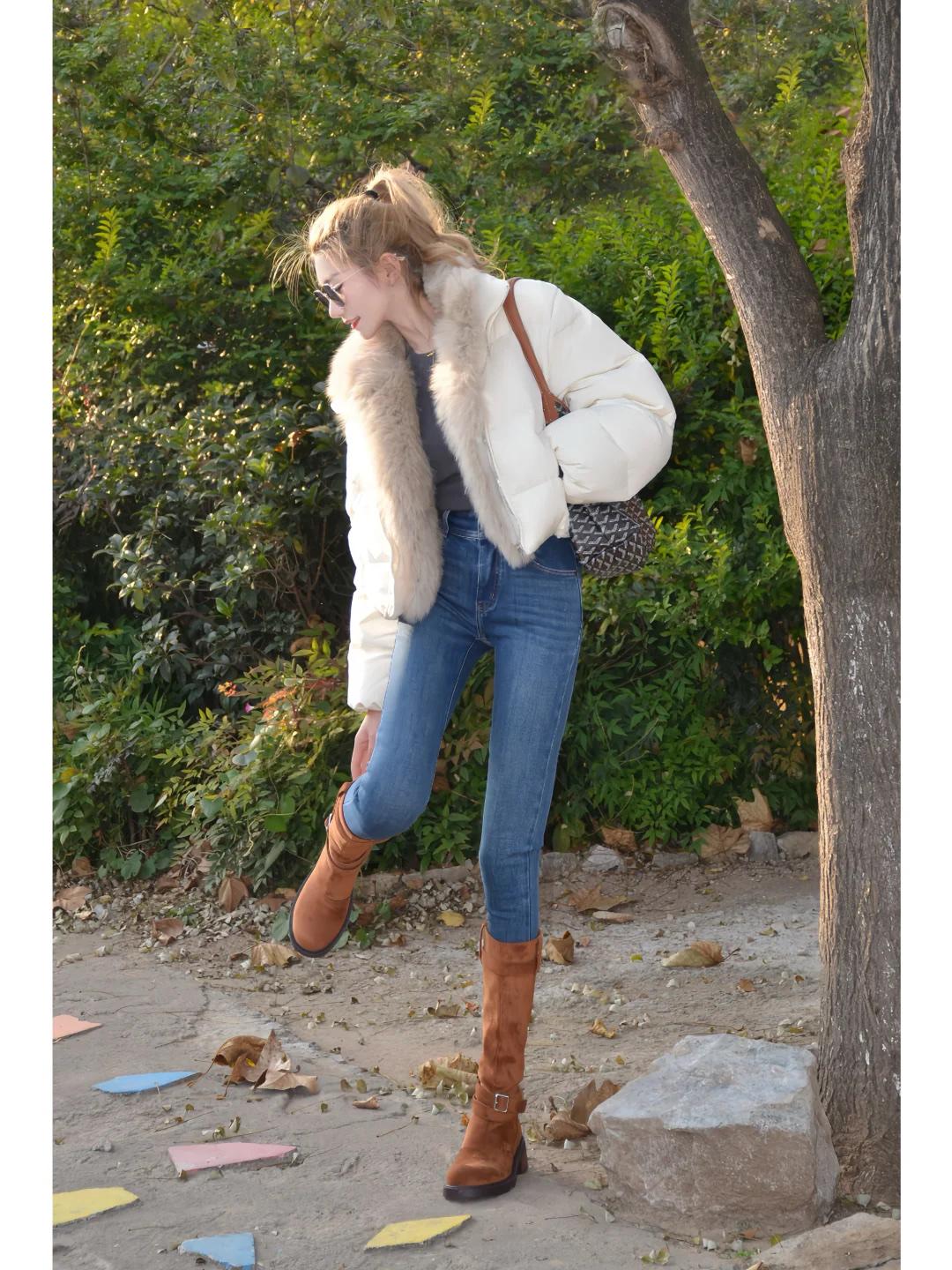 牛仔裤搭配靴子 加棕色毛绒外套 不仅保暖还时尚什么样的牛仔裤,显着身材性感