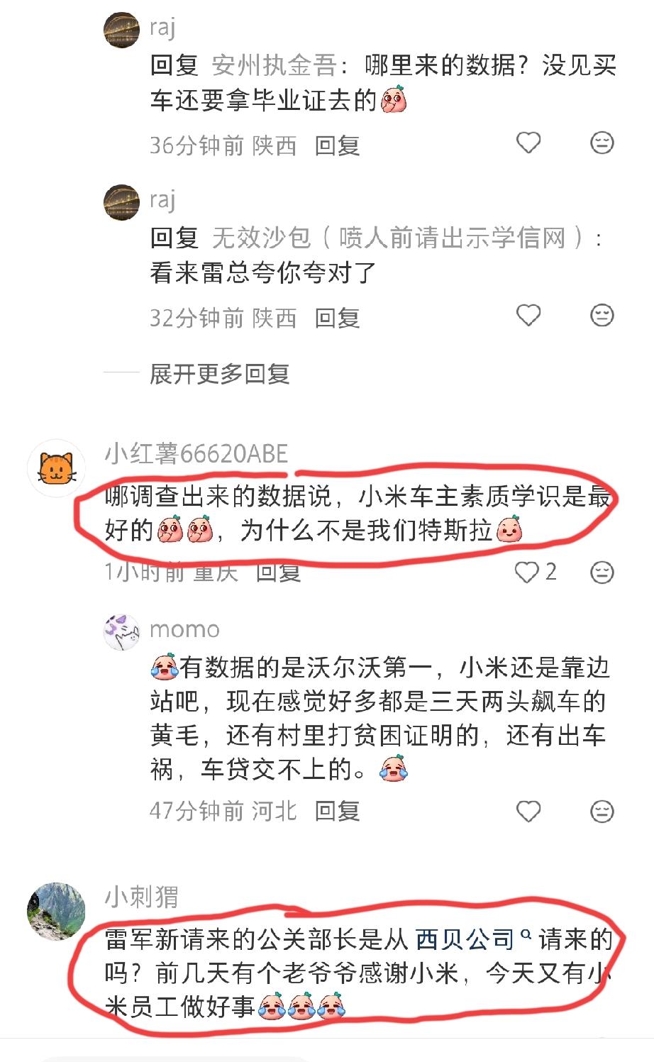 雷军转发并评论:小米车主都是素质学识最好的一批…… 此言一出,评论区网友立马就不淡定了。有网友表示: “为什么不是我们特斯拉车主,这都是哪里调查出来的数据说,小米车主素质学识是最好的”。 “雷军新请来的公关部长是从西贝公司请来的吗?前几天有个老爷爷感谢小米,今天又有小米员工做好事”。 …… 甚至有网友直接干脆说:我严重怀疑雷总就是在说反话,这是在讽刺米粉呢! …… 该说不说,小米车主大部分素质都是挺好的,但坏就坏在就是有少部分小米车主素质太低了,开车开的飞快,不打转向灯随意变道等等。就是这少部分人,严重拉低了小米车主整个群体的素质。难怪当雷总说出“小米车主都是素质学识最好的一批”,下面一片质疑的声音! 各位看官,你们怎么看?