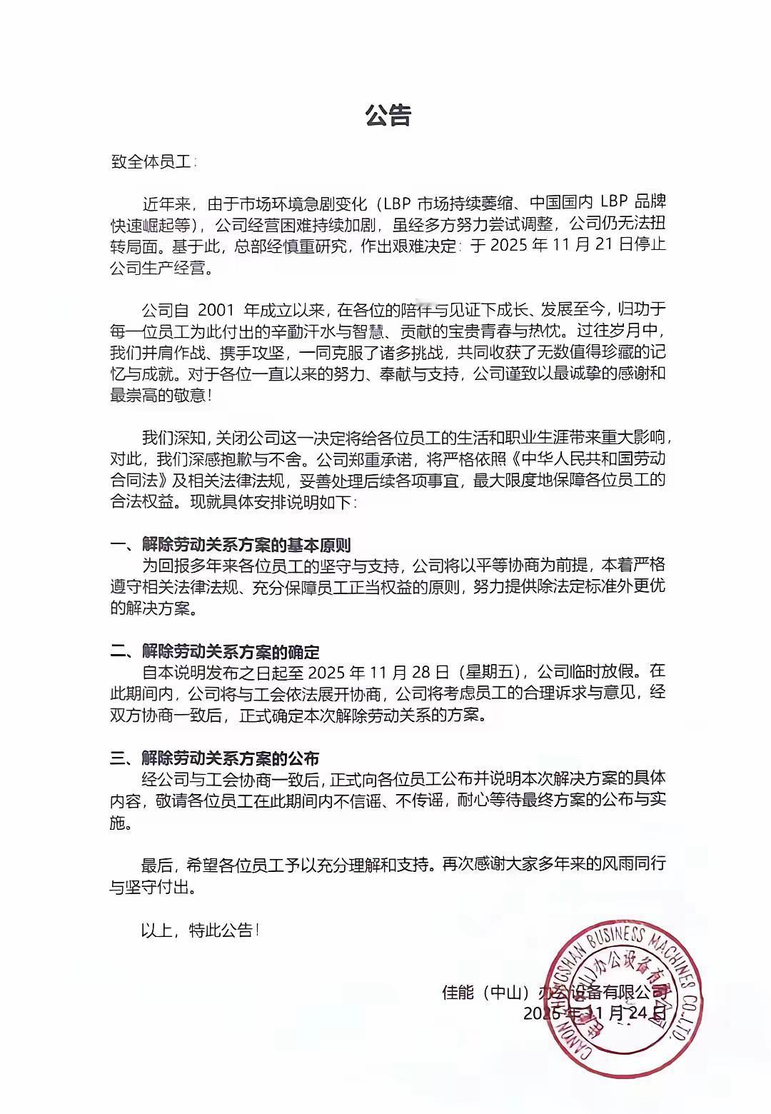 我的今日状态:😁轻松愉快 我这里的天气:☀️晴天 佳能中国中山,关闭中山地区佳能办公用品有限公司把工厂关闭并暂停运营。于11月25日,进行关闭。大家沟通协商解决解除劳动合同,最后感谢大家多年来风雨兼程的同行和付出 针对此事,大家怎么看?