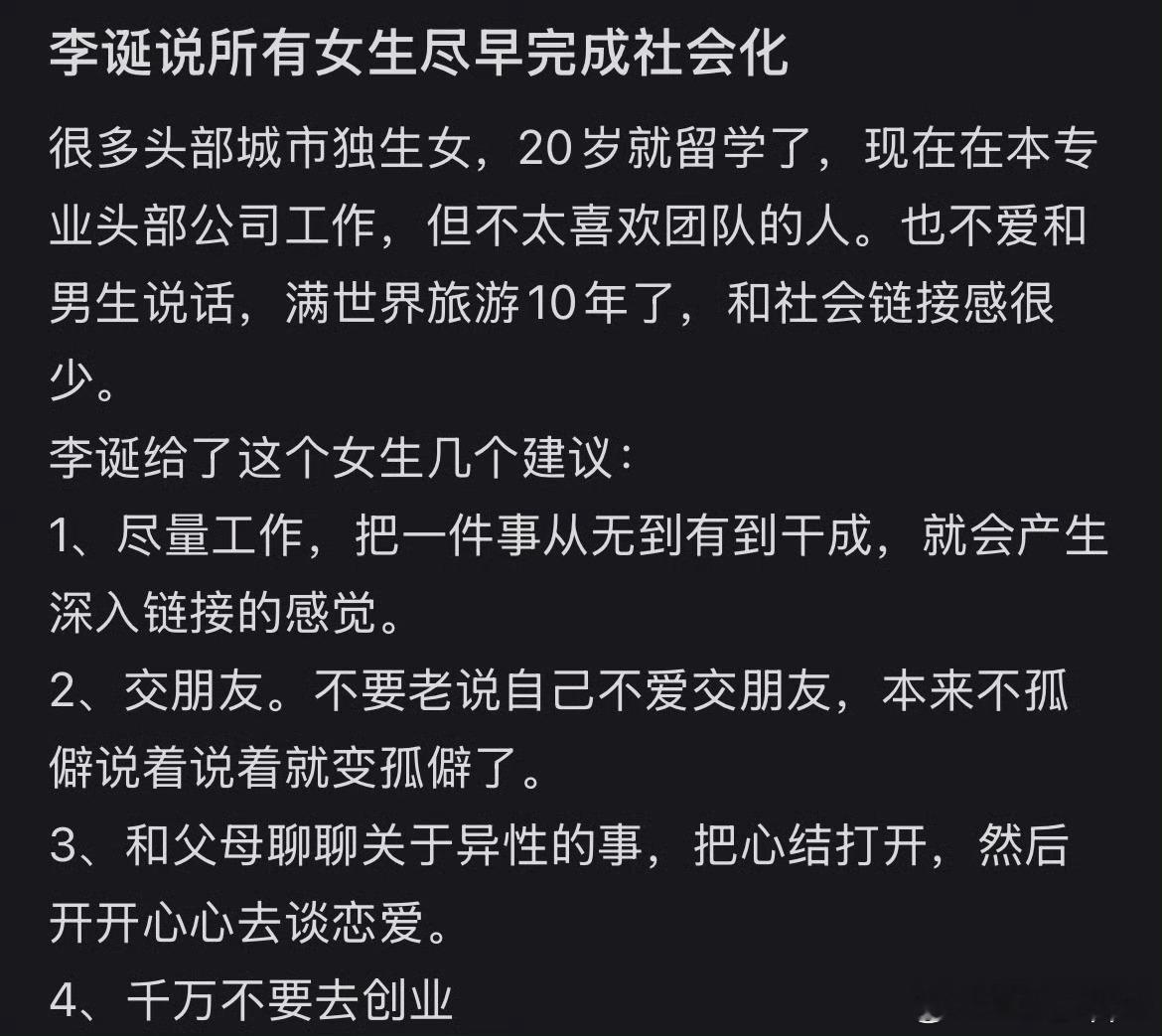 李诞 所有女生尽早完成社会化我觉得「社会化」这个词很妙,与人链接是一件很有趣的事情。我喜欢与人链接,跟不同的人接触会让我有不同的学习与思考。但当然会有受挫的时刻,我猜想或许一些不太愿意「社会化」的朋友,是不是会担心那些偶尔面临的狼狈、破碎、尴尬的境地,但在那一刻如果想撑着站起来,凭借着那股“老娘才是女主”的劲儿,我们一定可以千万次救自己于水火之中!请你务必一而再,再而三,三而不竭,千次万次,毫不犹豫地,救自己于这世间水火。尝试着与人链接,大胆探索,即使失败也没关系,关键是先走出这一步