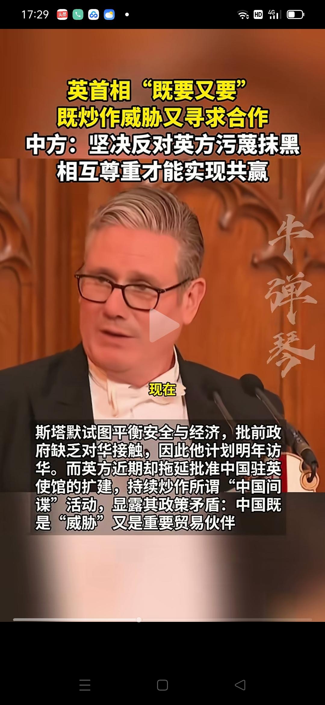 看不懂英国人唱的是哪出?首相将访问中国,登机前自己特意说几句中国不爱听的话! 常理是,去人家做客前,要说几句人家爱听的话,烘托气氛。但英国人反其道而行之,让人吃惊! 据报道英国首相斯塔默将于下个月访问中国,英国首相可是7年没来了。刚刚,在伦敦金融城市长晚宴上,斯塔默发表了一场演讲。其中谈到中英关系,先谈英国不能疏远中国,因为会吃亏,没钱挣。但话风一转,声称中国对英国构成“国家安全威胁”,并对香港说三道四。 英国人时不时拿出昔日“日不落”帝国的神态自居,斯塔默这个态度到中国还怎么“推心置腹”,还怎么强化双边关系? 中国驻英使馆已经明确表态,坚决反对斯塔默有关错误言论,对这种“既要赚中国钱、又要抹黑中国”的双标把戏提出批评。 英国对华立场 英国强硬表态 英国人常用表达 斯塔默称中国是“国安威胁” 英国最不敢惹的国家都有哪些?