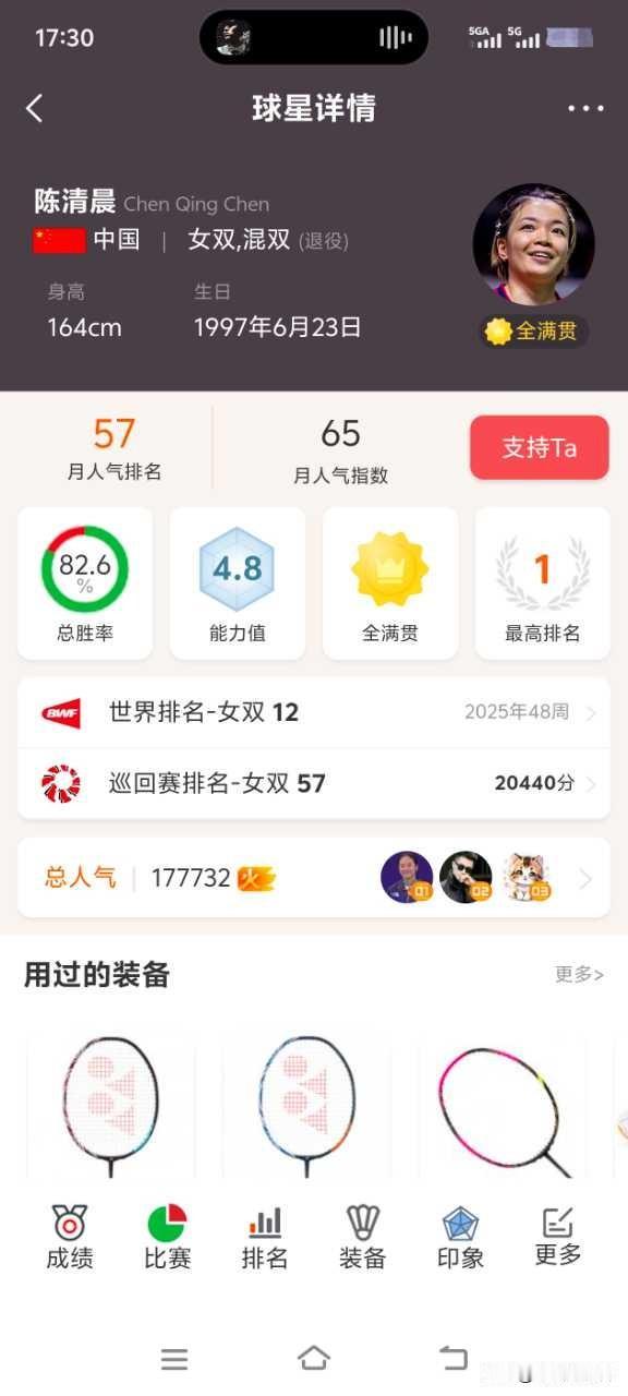 陈清晨今日退出世界排名啦。超级女双传奇凡晨退出现役,贾一凡还在坚持。致敬现役,祝