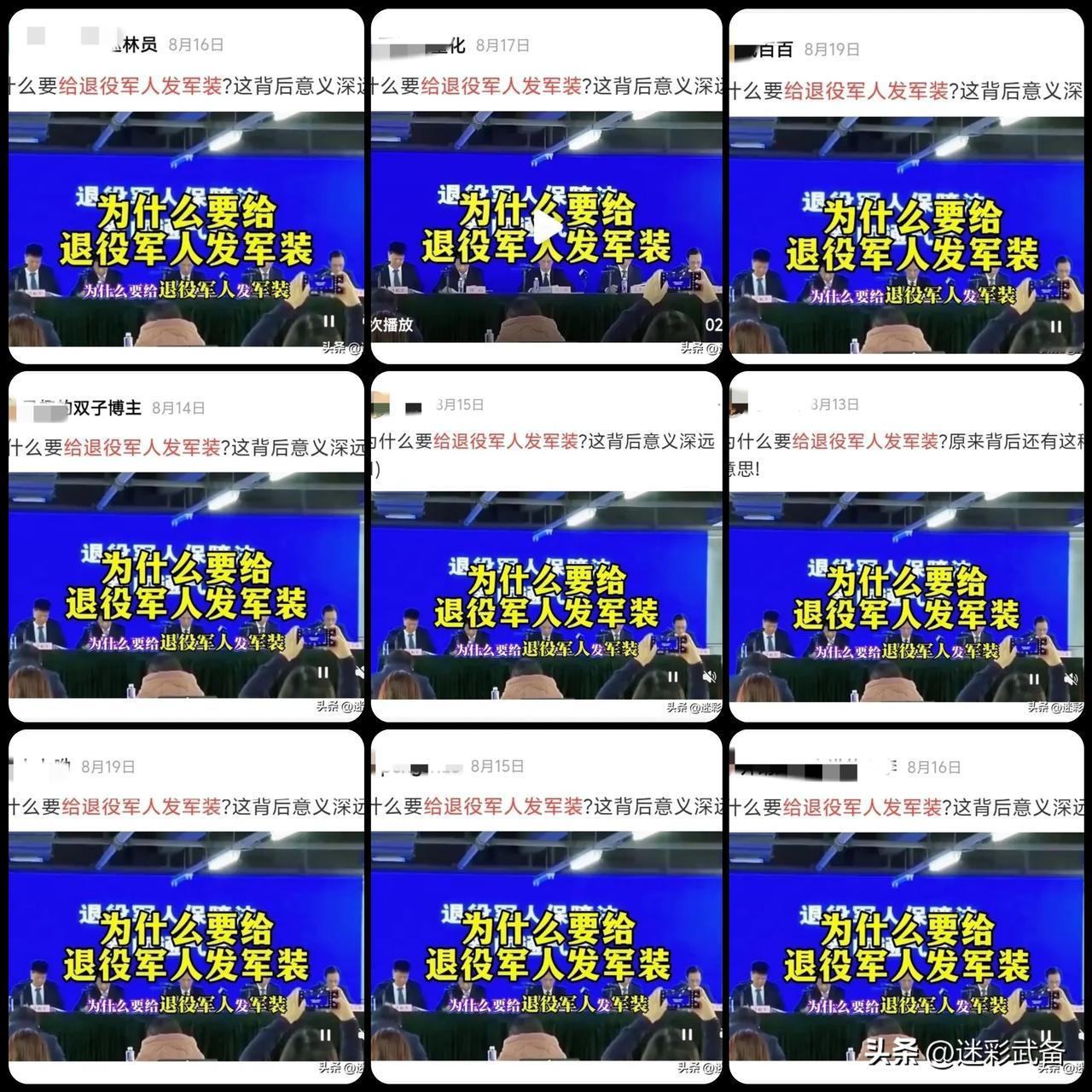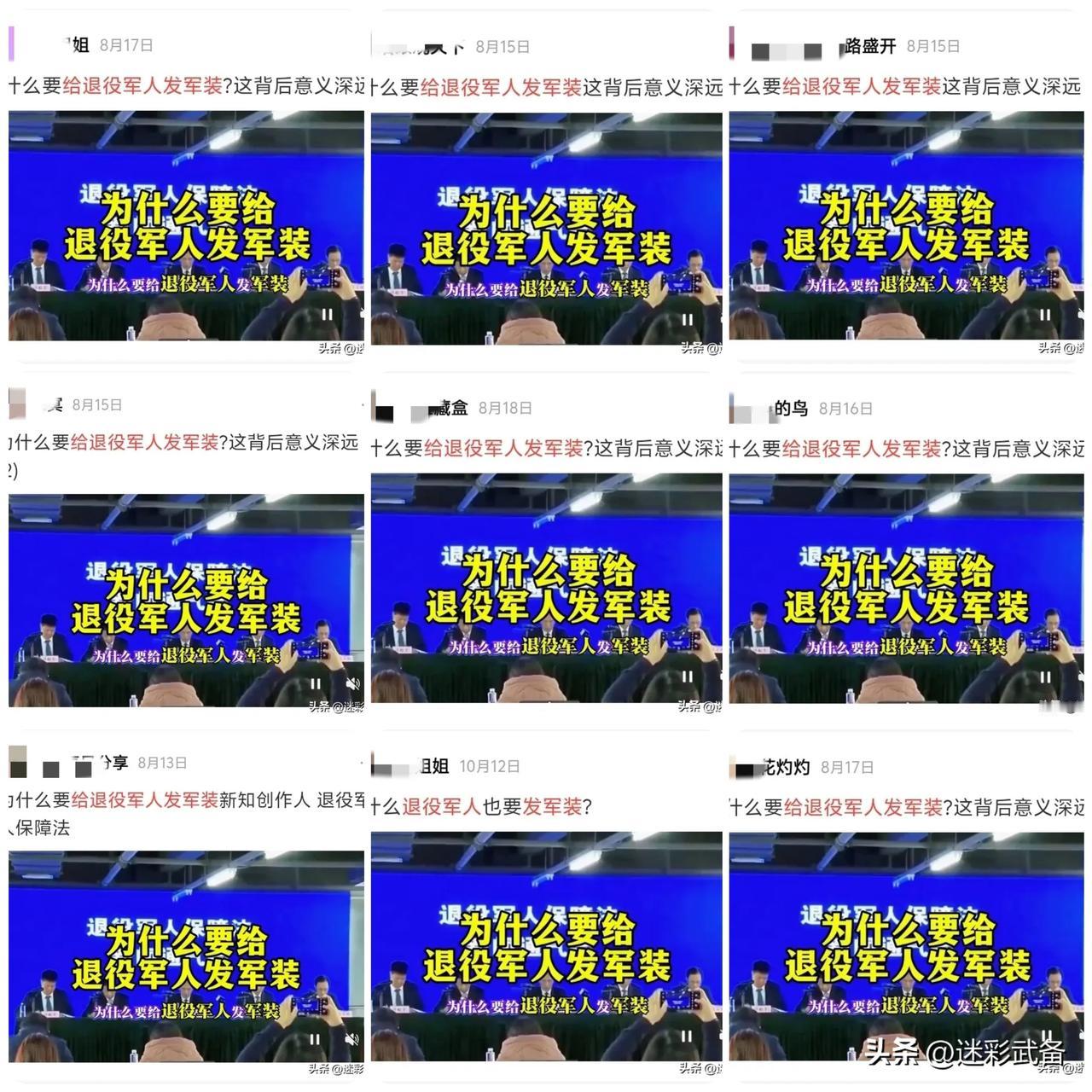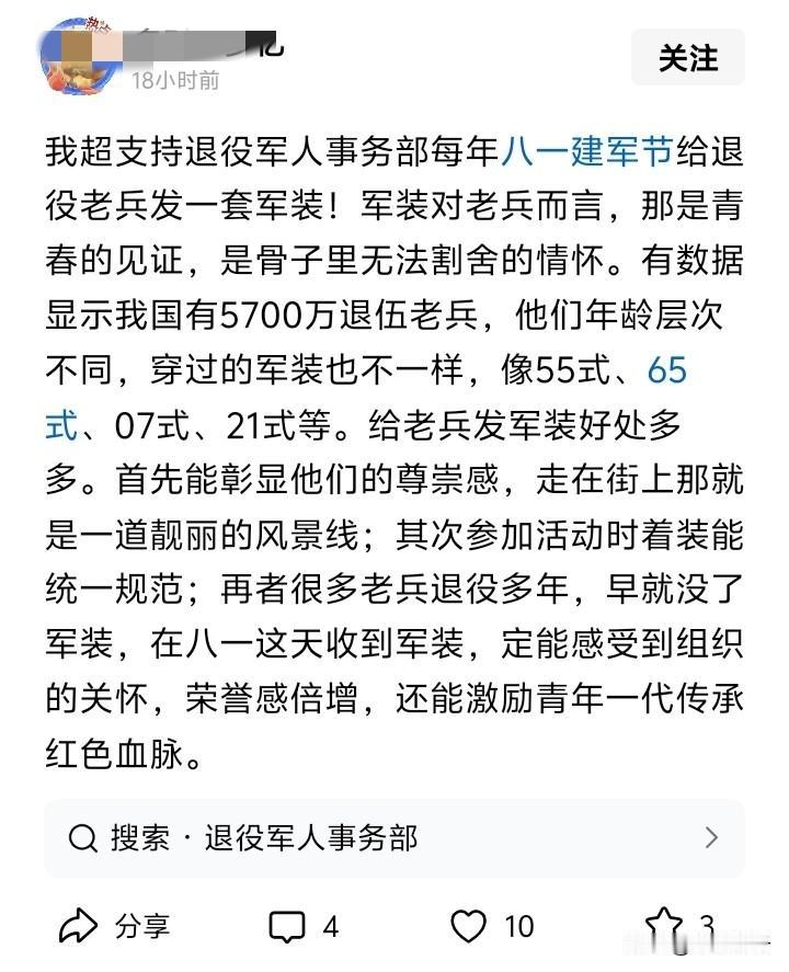 老兵们,强烈支持每年给退役军人每人发一套军装,这背后的意义太深远了! 根据退役军人事务局数据显示,全国退役军人3700万左右,每套军装从采购到运输及发放的人工成本加起来也就50元每套,全国发放也才区区18亿人民币而已!这是钱的事吗?关键是其背后的意义十分深远,举几个例子! 按照2003年教育部中小学图书室建设标准,每个综合配置型图书室的费用22万元,18亿也只够建设8181个图书室而已!管他什么孩子是未来栋梁之材,管他什么教育兴国。。。关退役军人什么事?江山是军人们打下来的,退役军人值得拥有这份荣誉,一套衣服而已! 按照西南易干旱地区建设60立方米蓄水池的每个成本3万左右,18亿也只就够建设6万个蓄水池而已!管他什么人畜饮水有没有问题,管他什么农民是国之基石。。。关退役军人什么事?江山是军人们打下来的,退役军人值得拥有这份荣誉,一套衣服而已! 按照国家给新生儿免费提供的乙肝、脊灰等疫苗综合成本也就每个孩子400元左右。18亿也只够给450万个孩子打疫苗而已!管他什么国民健康,就算以后国家没人了,关退役军人什么事?江山是军人们打下来的,退役军人值得拥有这份荣誉,一套衣服而已! 。。。。。。 退役军人曾经为国为民奉献了青春,给每个退役军人每年发一套军装怎么了,难道不应该满足一下虚荣心吗?每年才区区18亿,一套衣服而已! 一个看多了网络退役军人现状与有关退役军人话题,不屑于与其群分的退役老兵留!