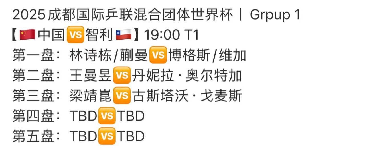 成都混团小组赛中国队VS智利 王曼昱出战女单啦 第一盘 林诗栋/蒯曼VS博格斯/维加 第二盘王曼昱VS奥尔特加 第三盘梁靖崑VS戈麦斯 让大家操碎了心, 徐瑛彬还是没有轮上, 估计安排男双吧! 今天这场输了也没事, 今天不上, 后面估计没有机会了, 国乒教练组不会搞平均主义, 教练要的是胜利, 要的是磨练奥运阵容! 曼昱状态不错, 这也是奥运阵容中的一组, 加油曼昱!