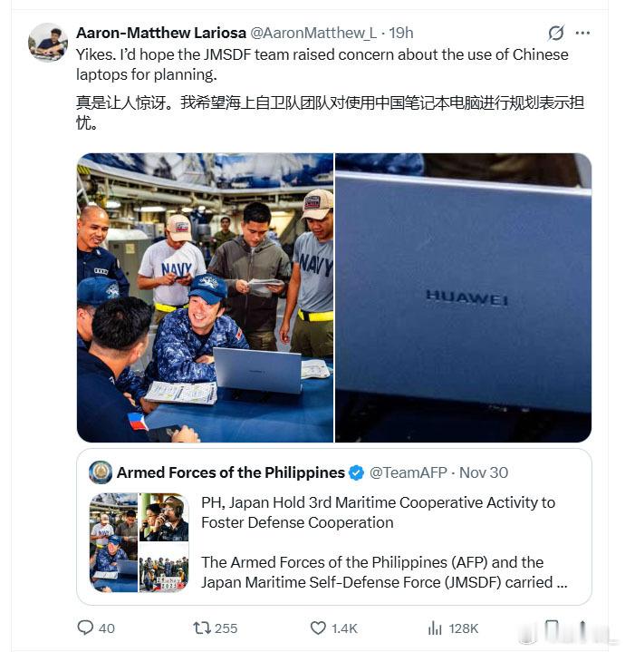 菲律宾亲美记者要求日本海自关注在其舰艇上使用华为笔记本电脑的“风险”。照片是菲军发布的菲日“海上合作”活动,菲军人员在海自102“春雨”号驱逐舰观摩。菲日勾连
