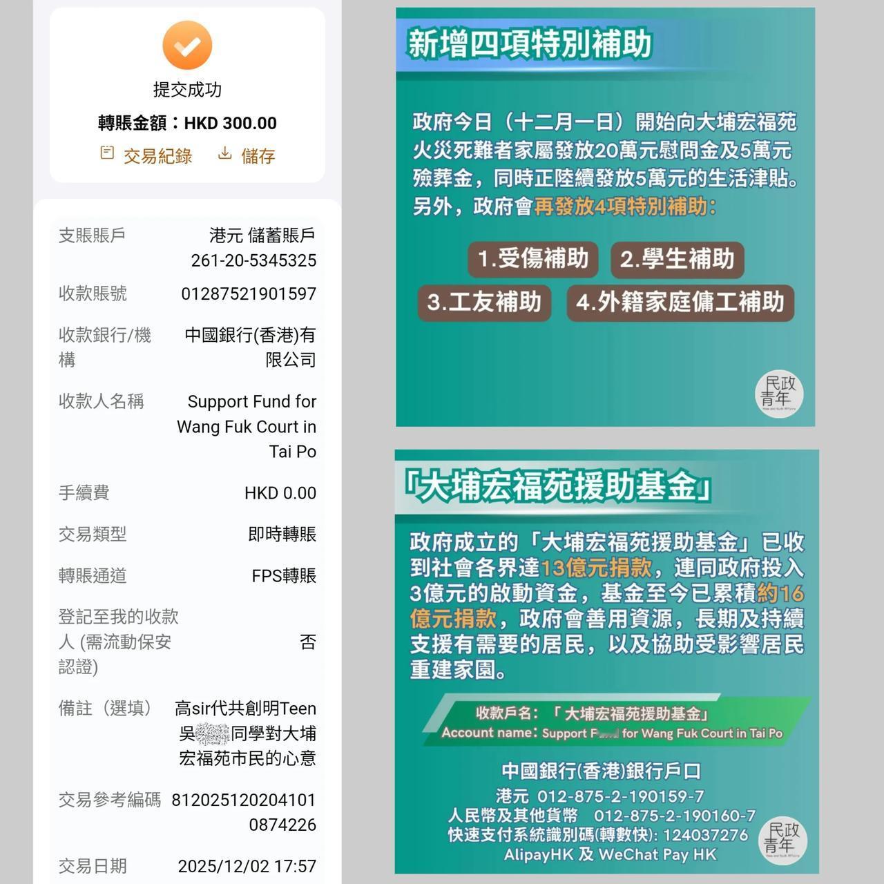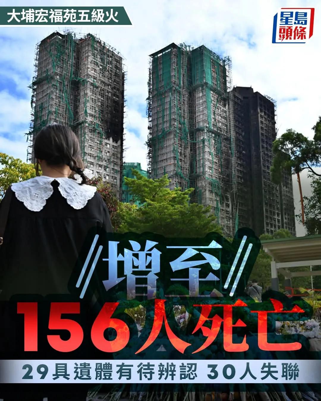 大埔宏福苑五级大火遇难人数上升至 156 人,仍有 30 人失联。 今天是遇难者「头七」 有殡仪馆举行公众悼念仪式,另外多名消防员为在执勤中殉职的同袍举行路祭,现场气氛肃穆,送别捨身救人的英雄最后一程。 警方调查行动仍在进行中,涉嫌「误杀」罪名被捕者累计增至15人,不排除有更多人被捕。 原先高sir打算送一份圣诞礼物给共创明Teen的同学,今天经同学的同意,改了代同学,对大埔宏福苑市民心意捐助一点心意。