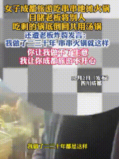 “这下出名了!”成都春熙路,一外地女子吃串串,撞见老板把别人吃剩的锅底倒回共用汤锅,本以为是眼花看错,结果老板不仅不认错,还拍桌威胁。 2025年12月2日凌晨,来成都旅游的小杨和男友刚落地,就直奔春熙路王府井百货门口的“猫哥串串”,因为早就听说这地摊串串人气旺,想着第一顿先尝个鲜。 两人刚找好位置坐下,小杨正低头翻菜单,眼角余光突然瞥见老板陈某端着几个油腻的空碗,径直走向后厨方向。 她抬头一看,心瞬间沉了下去:那碗里还剩着半凝固的红油和没吃完的签子,而陈某竟直接把这些剩汤剩料,一股脑倒进了门口那口冒着热气的共用汤锅! 汤锅里的油层瞬间泛起浑浊的泡沫,漂浮的食材残渣看得小杨胃里一阵翻腾。她以为是老板忙晕了手滑,可没等她开口,就见陈某又端来两盆邻桌的剩锅底,照样倒进了共用汤锅,动作熟练得让人心惊。 小杨实在忍不住,起身走到陈某面前质问:“你怎么把别人吃剩的汤倒回去?这谁敢吃啊!” 没成想陈某脸一沉,手里的勺子“哐当”砸在锅沿上,声音吓了周围食客一跳:“我做这行二三十年都这样!冷锅串串都这么弄,你们外地人懂什么?” 小杨男友忍不住反驳:“再老的规矩也不能用剩汤啊,吃了要生病的!” 结果,这话彻底惹恼了陈某,他往前凑了两步,手指几乎戳到小杨面前,拍着桌子吼:“少管老子的闲事!今天你要是让我做不成生意,我就跟着你们,让你俩在成都耍不痛快!” 见小杨拿出手机要拍,陈某更是口出狂言:“拍!你尽管拍!我这儿有电话,明天你两口子死了我赔你!” 周围食客吓得纷纷起身远离,小杨又气又怕,拉着男友赶紧退到路边,一边继续录下汤锅的画面,一边拨打12345投诉。 挂了电话,小杨越想越不对劲,又试着拨打刚才陈某留下的电话,发现已经停机,显然是怕被追查,故意断了联系。 于是,她干脆把视频发到社交平台,想提醒其他来成都的游客,没想到帖子很快被转发,不少当地网友在评论区留言曝料。 有网友说:“春熙路这些流动摊点好多都这样,本地人根本不去,我们吃完都会把纸巾、骨头倒进锅底,就是怕老板回收!” 还有位开火锅店的老板私信小杨,说正规锅底成本要二三十,回收锅底几乎不花钱,这些黑心摊点毁了整个行业的名声,自己每天倒锅底都要锁起来,就怕被人拿去用! 12月2日中午,当地市监就联系了小杨,说已经找到人了,他是无固定摊位的流动摊贩,之前就有监管难度,不过这次肯定会依法严惩,绝不会姑息。 后来小杨还提到,投诉后曾有人联系她,让她下架视频,好在她没同意,不然这事儿可能就不了了之了,现在想想,要是当时她没看见,或者怕麻烦没举报,不知道还有多少游客会误食“口水油”,想想都觉得后怕。 视频传上网,网友们也炸了锅:“这老板也太嚣张了,‘做二三十年都这样’?合着坑了游客这么多年!” 老话说,“民以食为天,食以安为先”,串串火锅是成都的招牌,靠的是真材实料和干净卫生,店主为了省点成本,用“口水油”赚黑心钱,不仅坑了食客的健康,更是砸了成都美食的名声。 就像“一颗老鼠屎坏了一锅汤”,以后游客再看到春熙路的地摊串串,难免会想起这事儿,正规店家的努力也全被连累了。 但气愤归气愤,小杨能及时举报,监管部门能快速介入,也算是不幸中的万幸。成都的美食名声,靠的不是黑心摊点的低价引流,而是每一家店家的诚信经营,游客的放心,也不是靠运气没遇到坑,而是靠监管的严格和大家的共同监督。