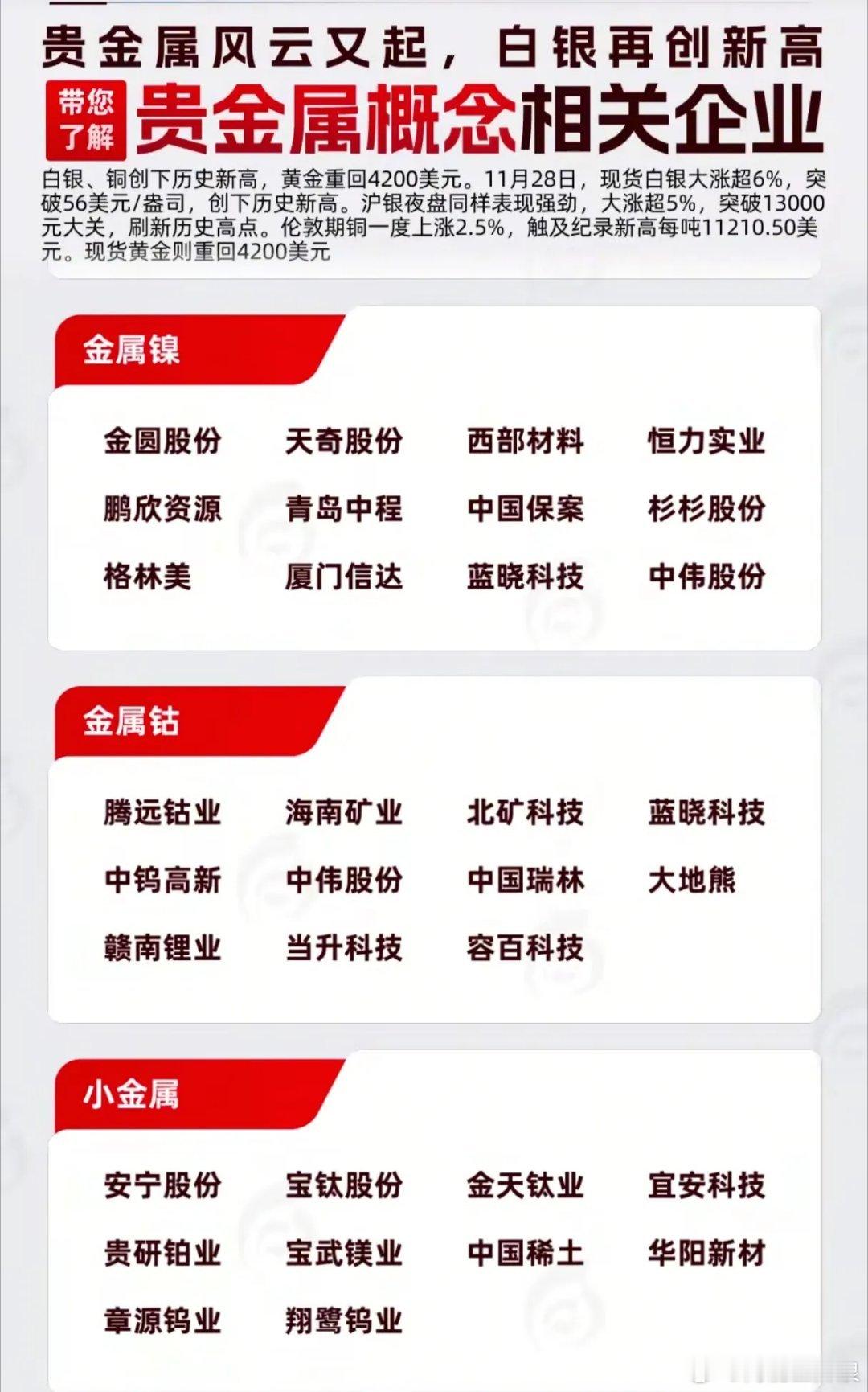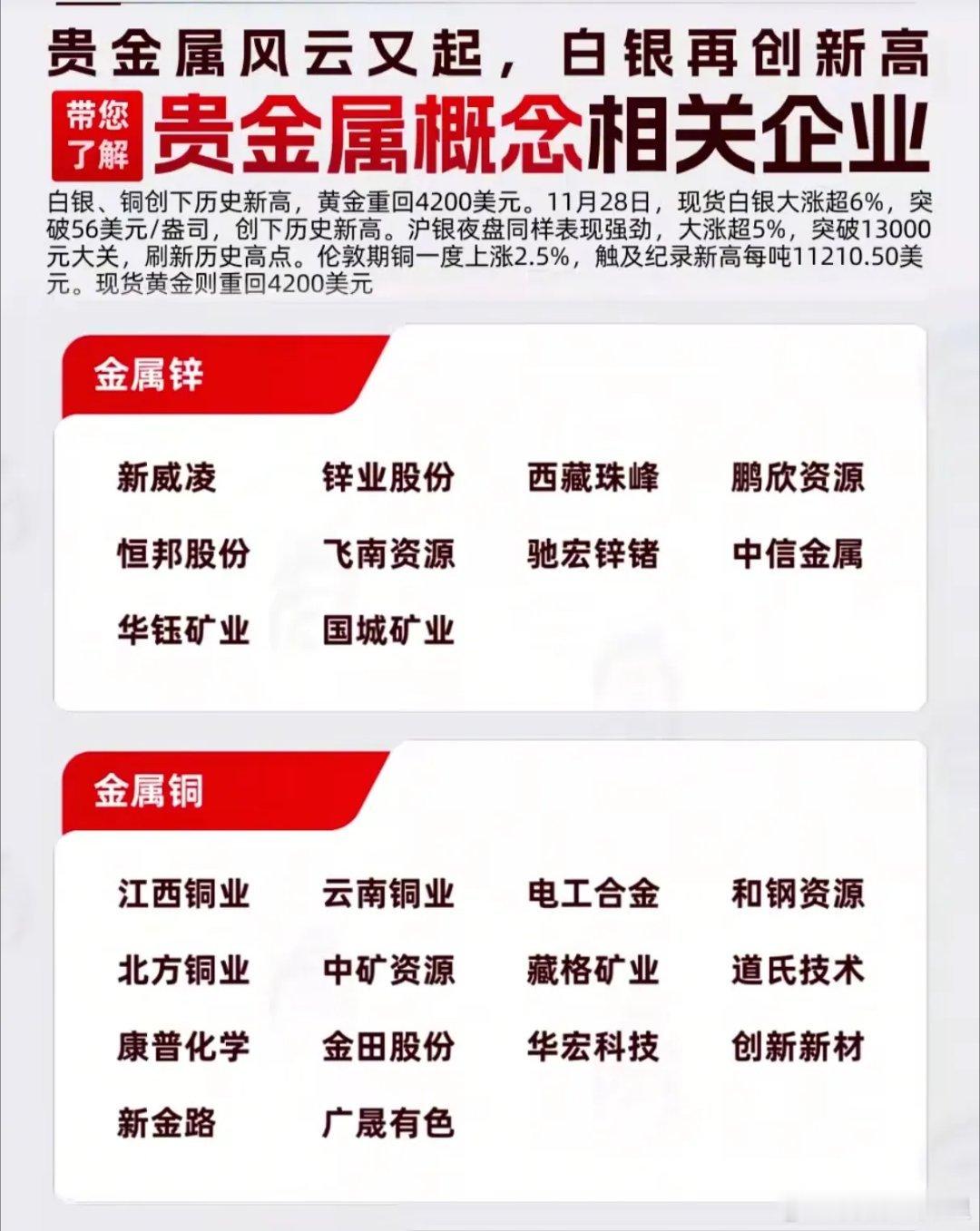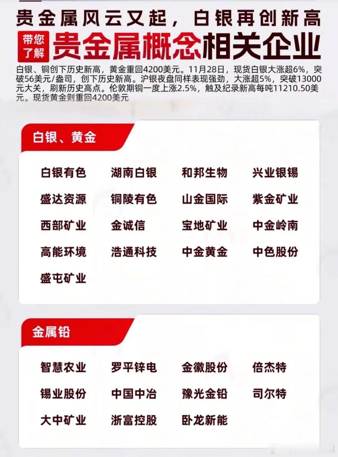 白银暴涨6%破56美元,这些企业为何成“黄金赢家”?11月28日的贵金属市场堪称“疯狂”:现货白银单日狂飙超6%,突破56美元/盎司创历史新高,沪银夜盘同步大涨5%站上13000元大关,伦敦期铜也触及11210美元/吨的纪录高位。这轮暴涨绝非偶然——连续5年的全球白银供需缺口(2025年缺口超9500万盎司)、光伏/AI工业需求激增,叠加美联储降息预期,共同点燃了这波行情。而在A股市场,白银有色、盛达资源等企业已率先吃到红利:盛达资源前三季度净利润暴增62%,紫金矿业等龙头则通过海外收购扩大产能。从图片中的企业清单看,白银、黄金板块集中了20余家核心标的,金属铅、锌、铜领域也覆盖了智慧农业、江西铜业等细分龙头。值得注意的是,这轮行情呈现“产业链分化”:上游矿企(如西部矿业)靠“量价齐升”赚得盆满钵满,下游珠宝商却因成本高企订单缩水。但对于投资者而言,这些直接绑定贵金属价格的企业,正成为对冲通胀与政策风险的“硬通货”。