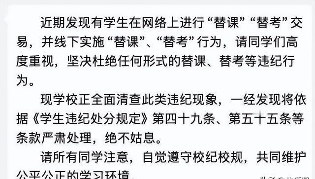 高校灰色交易曝光:学生用暗语绕过平台审核代课代考 【被扒出!高校代课产业链浮出水面:20块钱就能坐堂听课,800米体测50块找人代跑…】 "代课""代跑"怎么就成了高校里的灰色生意?记者悄悄去看了看,发现上海好几所高校的学生,都在校园里的社交群里明目张胆地交易代课服务——一节课20块钱,800米体测50块钱找人代跑,就连用表情包当暗号都能躲开平台检查! 课堂上,替考的学生要么低头玩手机,要么干自己的活儿;到了体测,监考老师对那些长得明显不一样的"替身",也假装没看见。更讽刺的是,当老师在讲台上提醒"别做这种不好的事",要代课的学生还主动多给了钱! 有高校已经赶紧发通知说要严查,但这事儿的根在哪儿呢?专家一句话点透:要是上课成了走形式,学分变成能买卖的东西,那整个教育评价体系都得好好反思。学生们用逃课来"投票"的背后,其实是教学质量整体往下掉啊。 这事儿你咋看?是学生太偷懒,还是高校得改改了? -search.byteimg.com/img/labis/49a8f5a1ed9dbc4b216563c95a7c9b58~480x480.JPEG
