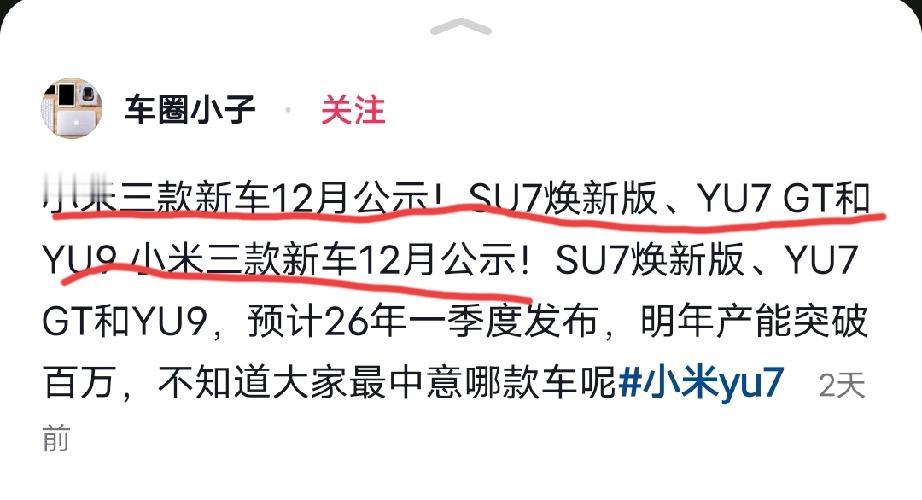 小米yu7上市至今的交付量估算。6-10月交付了80855台,11月份具体数据虽然没有出来,我们算他3.5万台好了,那他就是交付了11.5万台。 当初小米yu7上市一小时可是卖了28.9万台,那就是还有至少17万台小米yu7还没有交付吧。 这几天网上多位博主又在吹小米汽车12月份有三款新车公示:su7换新版、yu7GT和yu9,还说明年一季度发布。我就在想,怎么可能呢?就算小米yu7和su7 6月以来没有卖,还有17万yu7没有交付呢,怎么又要卖新车了呢?他的产能这几个月也没见提升多少啊!