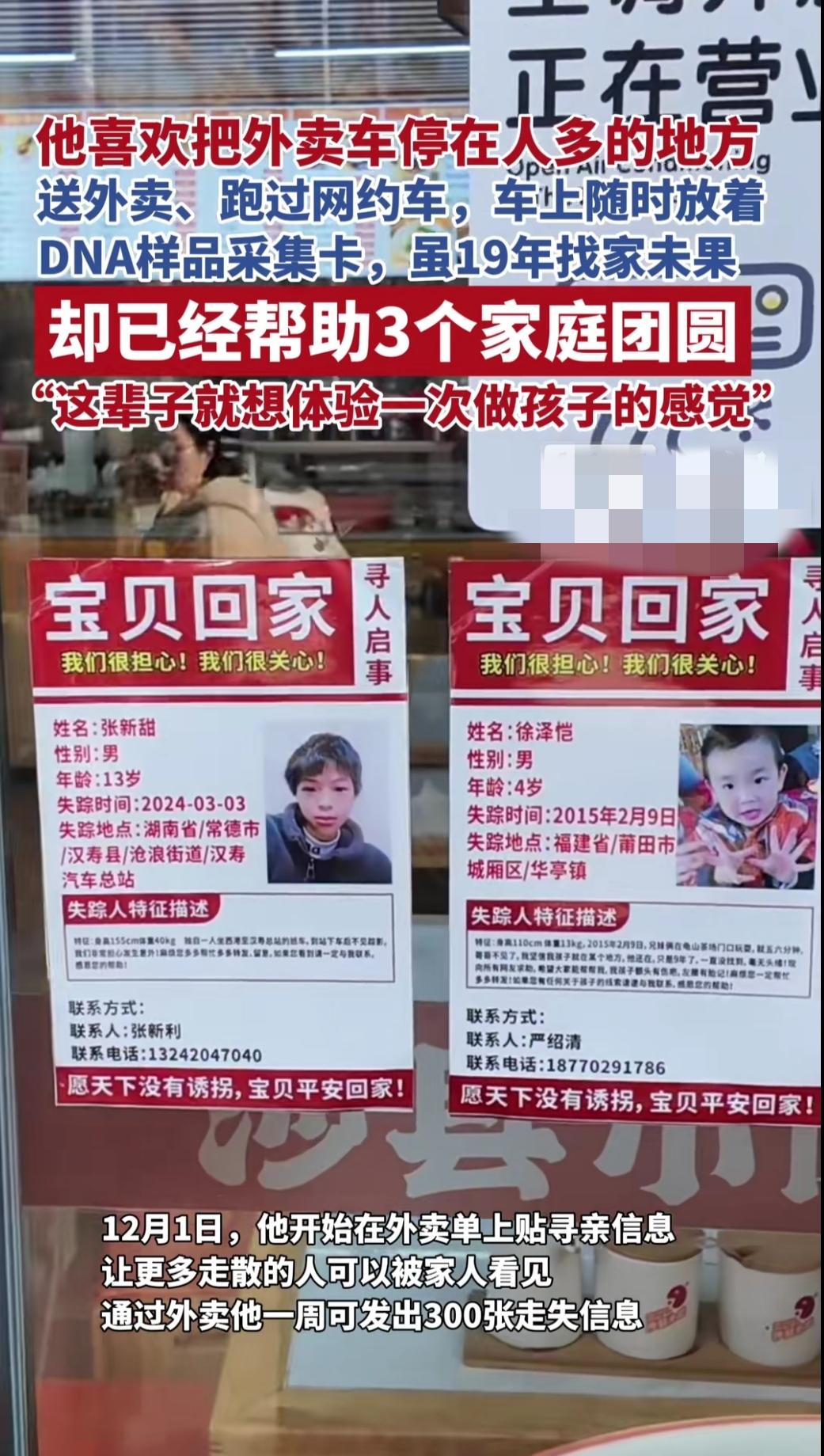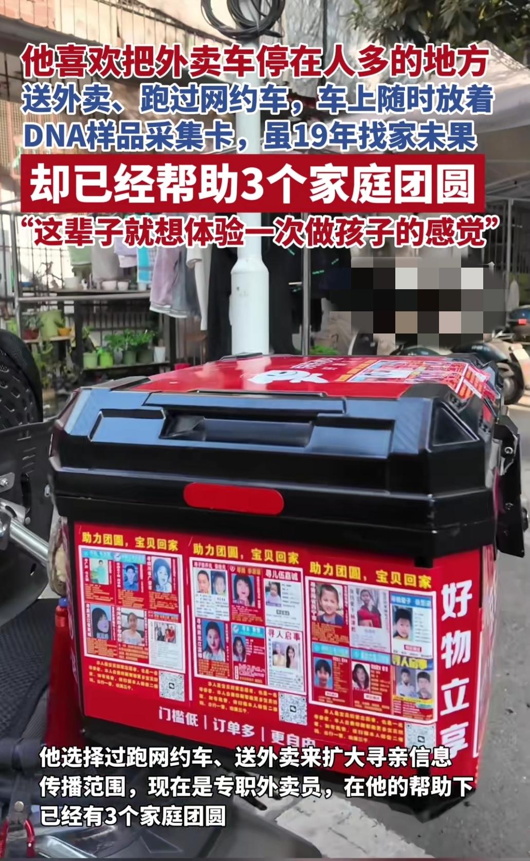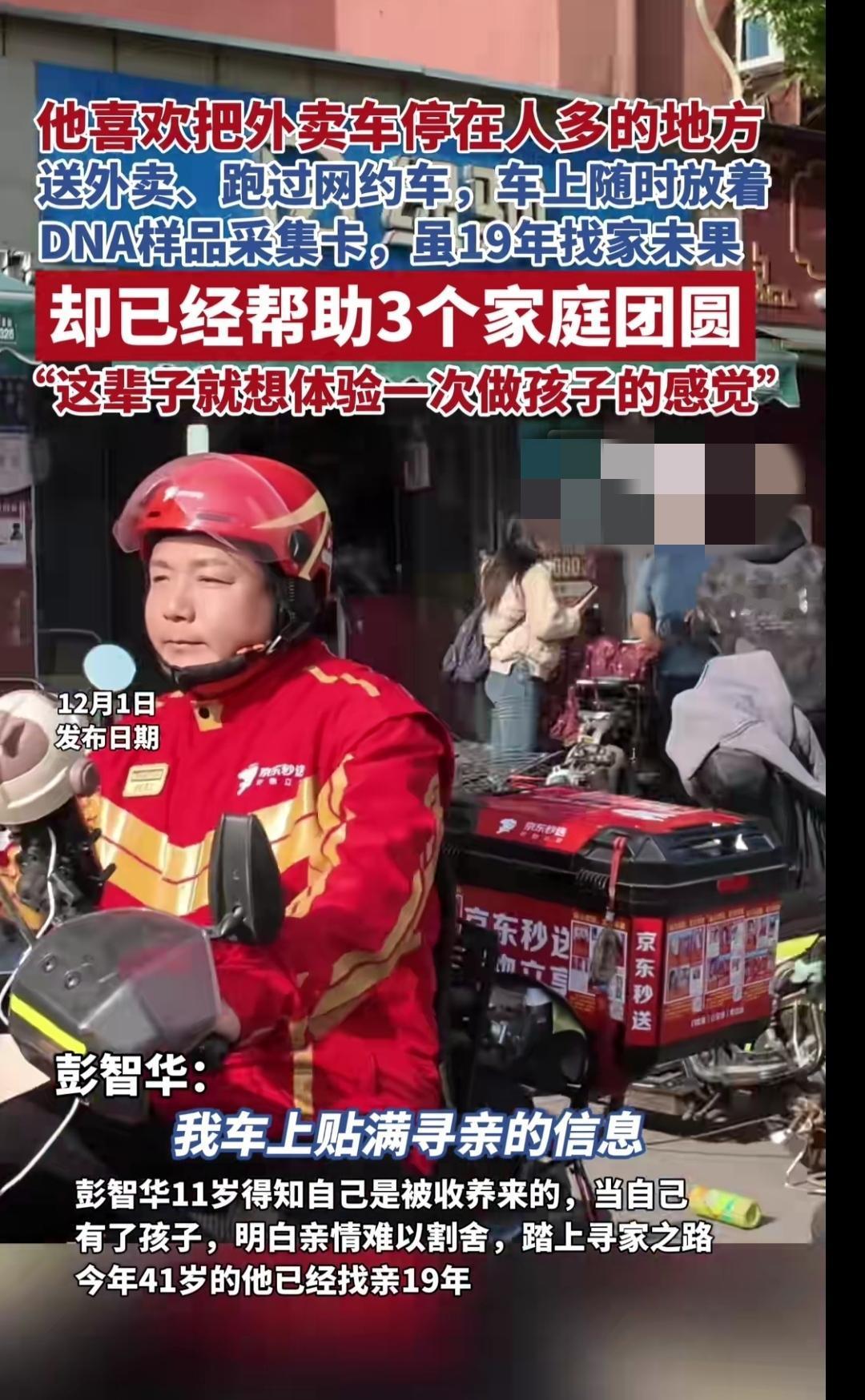 刷到外卖员彭智华的故事,我盯着屏幕看了好久。41岁的他送外卖时,车箱贴满寻亲启事,兜里常年揣着DNA卡,自己找家19年无果,反倒帮3个家庭圆了团圆梦。 11岁知道自己是被收养的,成家有娃后,那份“找亲生父母”的心思更烈了。跑网约车、送外卖,只要停在人多的地方,就掏寻亲卡分发,连外卖单上都贴信息,一周能发300多张。 别人问他图啥,他说就想体验一次“被爸妈喊小名”的感觉。自己还困在寻亲的遗憾里,却先伸手拉了别人一把——这车上的每张启事,都是他把自己的苦,熬成了别人的光。 其实善良从不是惊天动地的大事,而是明知自己难,还愿意给别人搭把手。这位外卖小哥的车,装的不是谋生的餐品,而是人世间最真的温情。