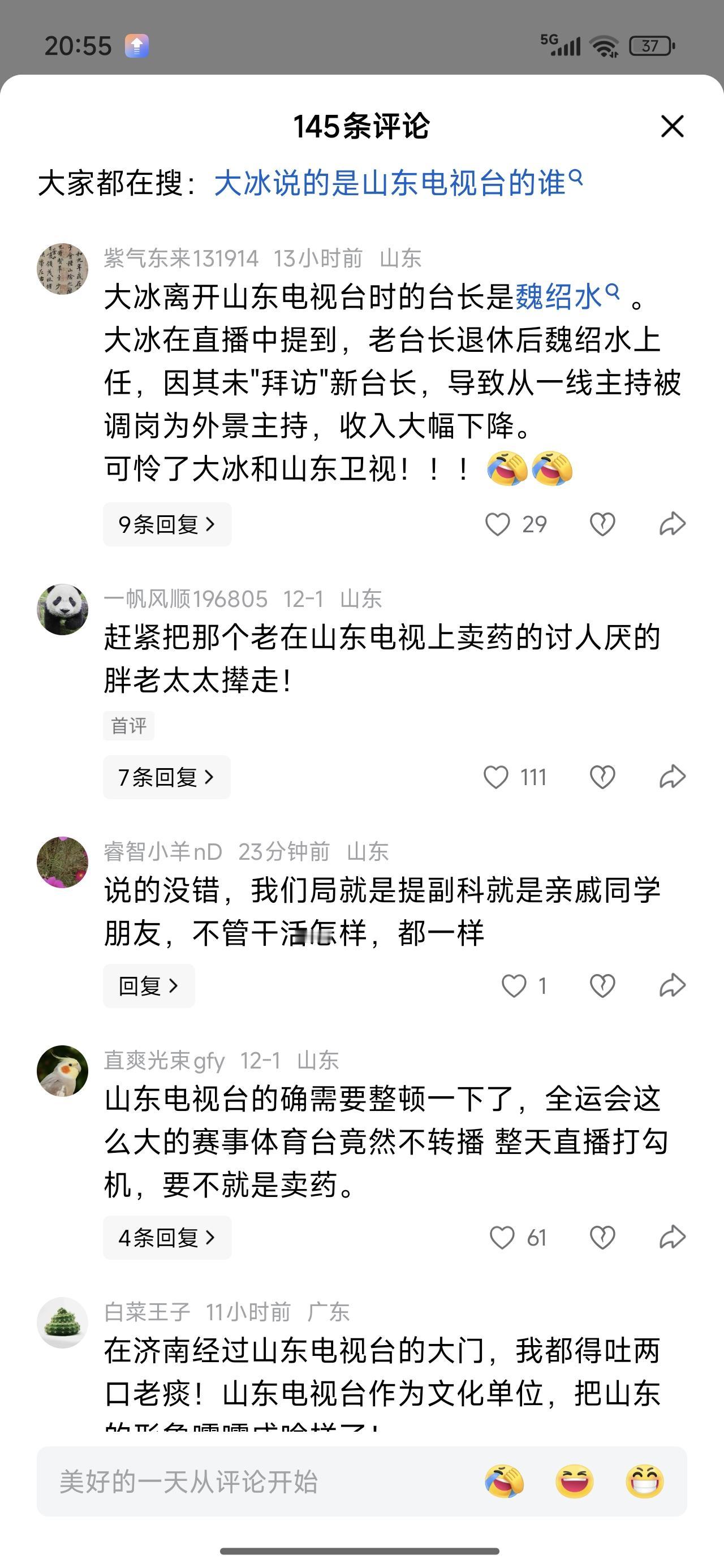 山东台的副台长进去了!哎呀,能说点什么啊!是不是当年打压大冰的那个啊!不知道,有可能。只能说有可能。 时隔多年,好像大冰也释怀了。没有当年的打压,大冰也不可能去那么多的地方,见那么多的人。来酒吧,做银匠,写书,等等。 有了经历以后,开直播,倾听那么多人的故事。帮助很多人梳理情感,认清现实,给予指导。 山东电视台广告很多。不知以后会怎样。好像也没多少人关心,心思都在手机上。