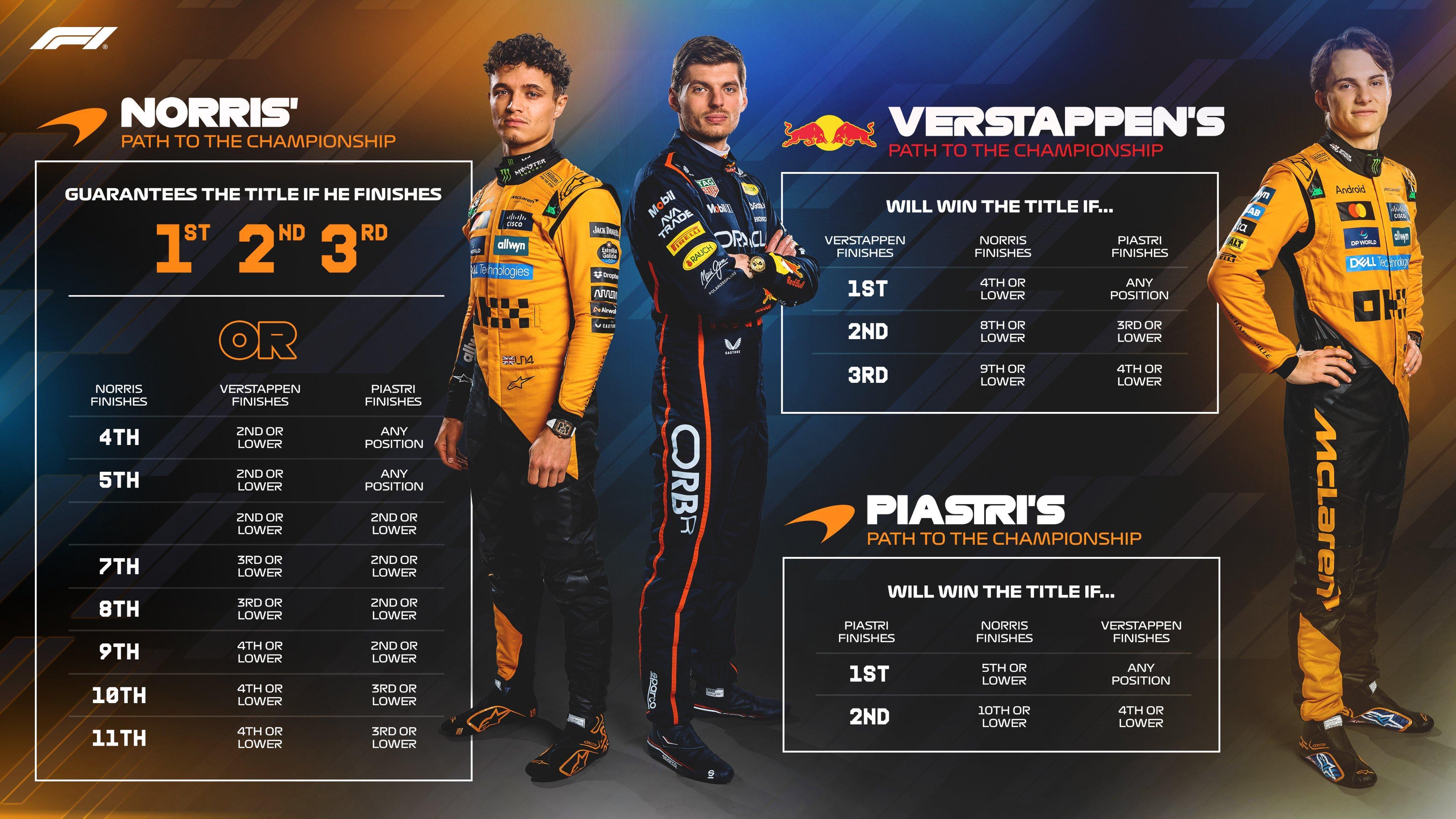 诺里斯、维斯塔潘、皮亚斯特里在阿布扎比赢得车手总冠军分别需要的条件⬇️F12025F1阿布扎比大奖赛