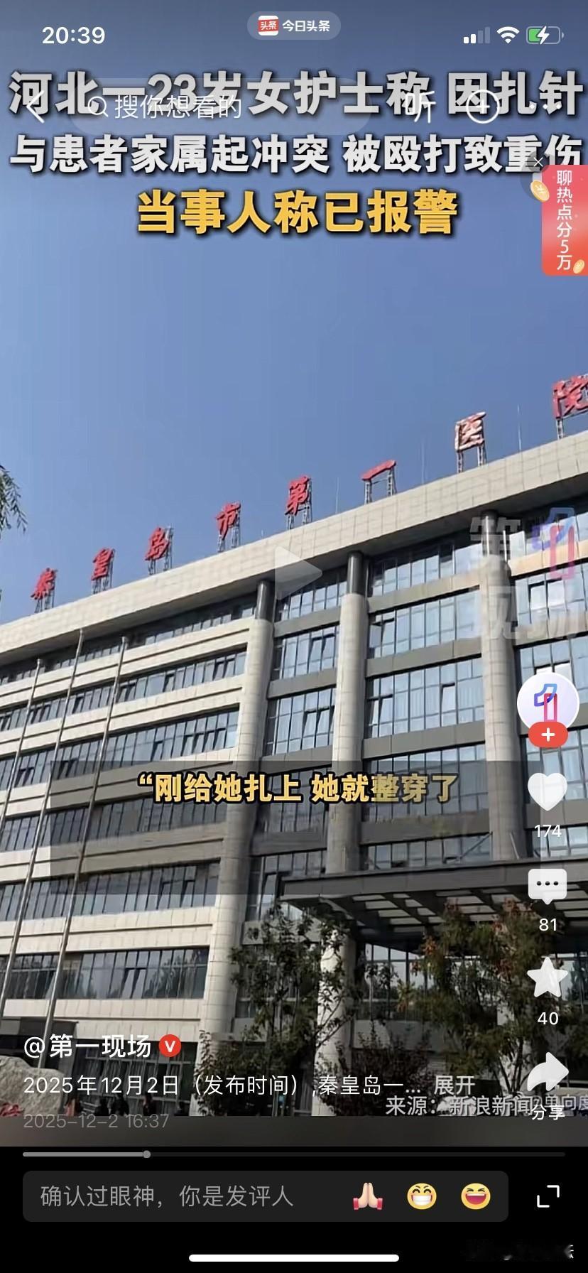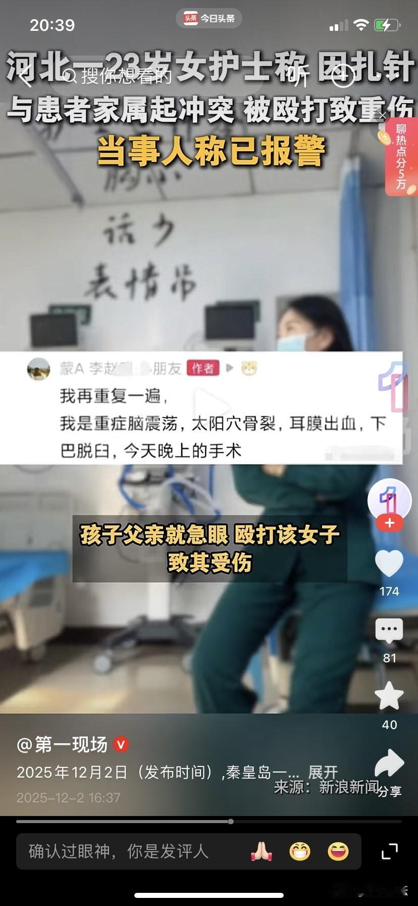 女护士因扎针被患者家属殴打成重伤。 2025年12月2日,一位女子在网上爆料称:自己今年23岁,在秦皇岛一家医院当护士。12月2日六点多,一名男子带着一个小女孩说是感冒了需要输液,谁是这个小女孩生性好动,女护士扎了三次针都被小女孩整穿了,结果小女孩的父亲就急眼了,一拳打到得自己太阳穴骨裂,耳膜出血,下巴脱臼,当晚就在医院做了手术,被诊断为重伤四级。 只能说这名男子太护犊子了,明明是自己的女孩好动,怎么能把怒气发到护士身上,而且也下手太狠了。现在医生和护士也成了高危职业。 目前,被打护士已报警,打人男子已被刑拘。