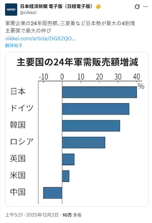 实锤了!年增40%,日本武器这下要卖疯了! 刚看到新闻,日本那几家大军工企业,去年的销售额猛涨了40%,全球主要国家里增幅排第一。这可不是小打小闹。 最关键是,动作全对上了。三菱重工刚拿下澳大利亚上百亿的军舰大单,还要往美国卖“爱国者”导弹,往菲律宾卖防空导弹。以前卖点零件,现在军舰、导弹这种“硬货”都开始往外搬了。 说到底,就是日本自己改了规矩,拼命给军工产业开绿灯。一边国内军费年年涨,一边急着把武器往外推,这心思再明白不过了:它已经不满足自己造自己用,是真想变成亚太地区一个主要的“军火卖家”了。 这变化,咱们可看清楚了? Source: X