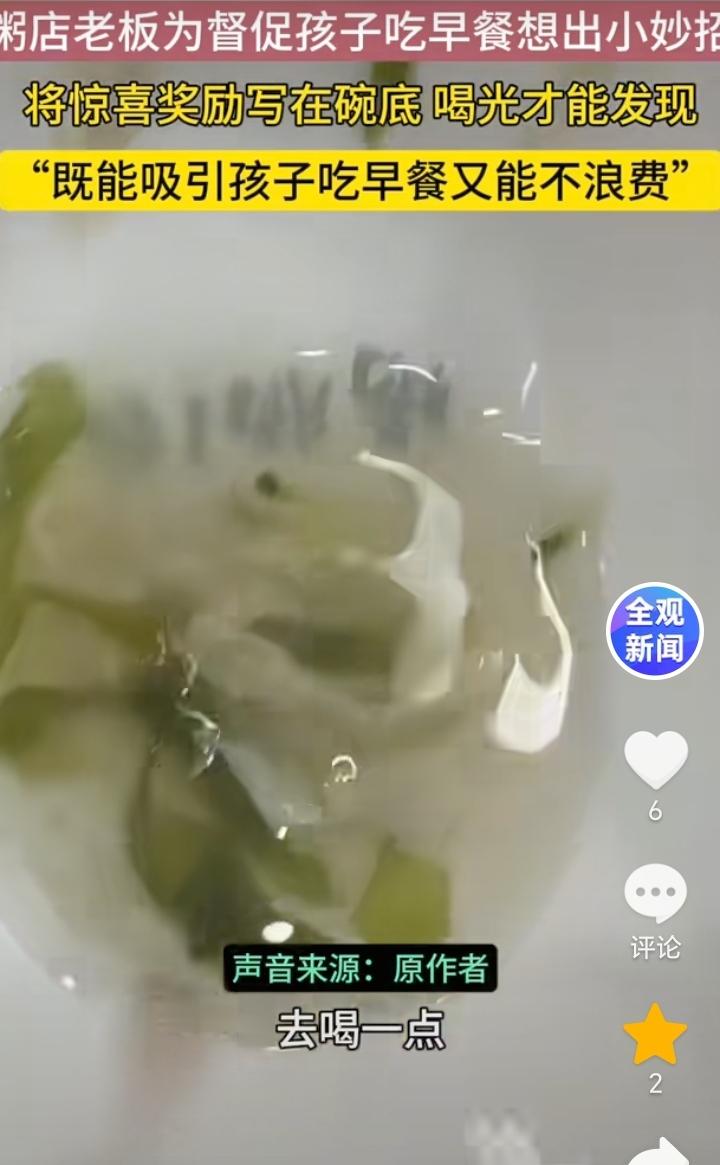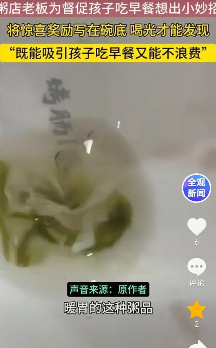 一举多得!山东临沂,一粥店老板为了能督促孩子吃早餐想出了一个小妙招,粥店老板把碗底藏着惊喜,只有孩子把碗里的粥喝完才能发现,这样既能让孩子喝上暖胃的粥,又能实现光盘行动,对此家长们的反馈也是不错,孩子们也都不赖床了,都能积极的要求去吃早餐。从视频中可以看出碗底写有鸡蛋一个,苏打水一瓶,烤肠一根等等。 用碗底的小奖励去激发孩子们的好奇心理,这样不仅能让孩子们积极的去吃早餐,还能实现光盘行动不浪费,又能增加店里人流量,可以说是一举多得。 粥店老板非常有做生意的头脑,千篇一律不如独树一帜,只有不断创新才能有好的发展,粥店老板算是抓住了做生意的精髓。